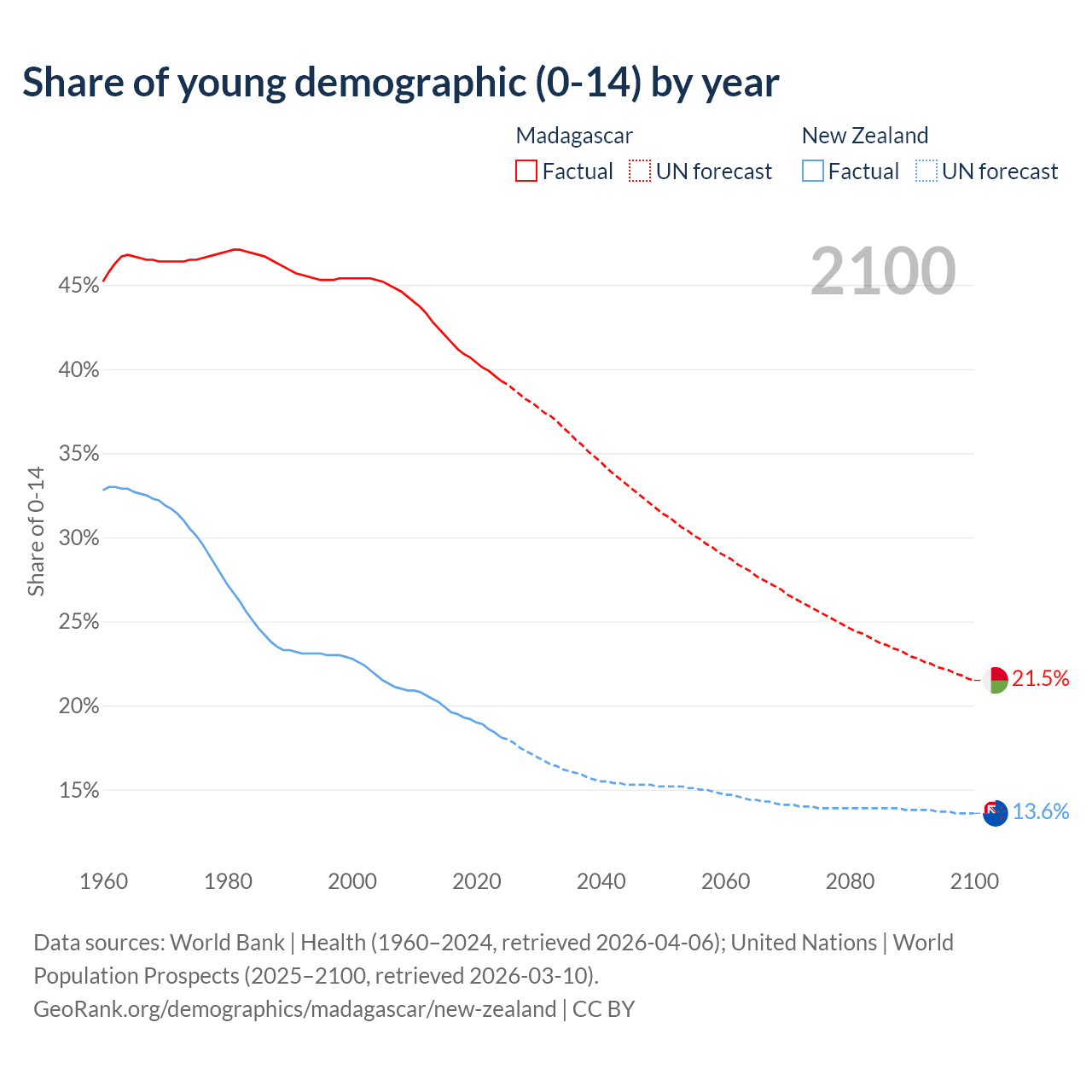 - The share of young demographic (0-15 years old) in Madagascar is 39.3% vs 18.1% in New Zealand.
