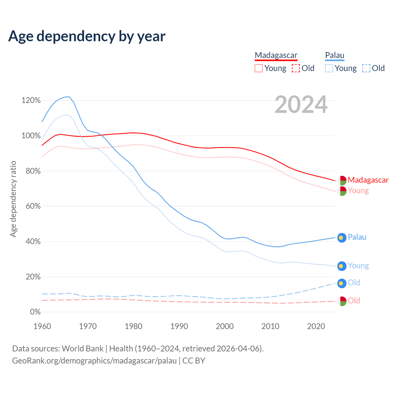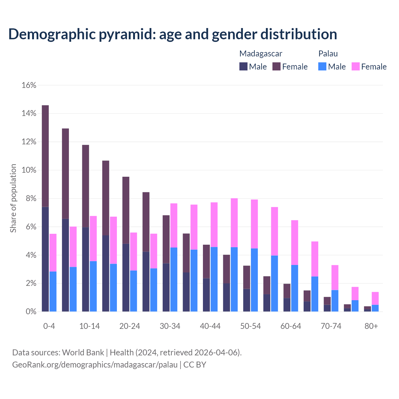 The share of older people aged 65 and over is 3.41% in Madagascar and 11.3% in Palau. Life expectancy in Madagascar compared to Palau .
