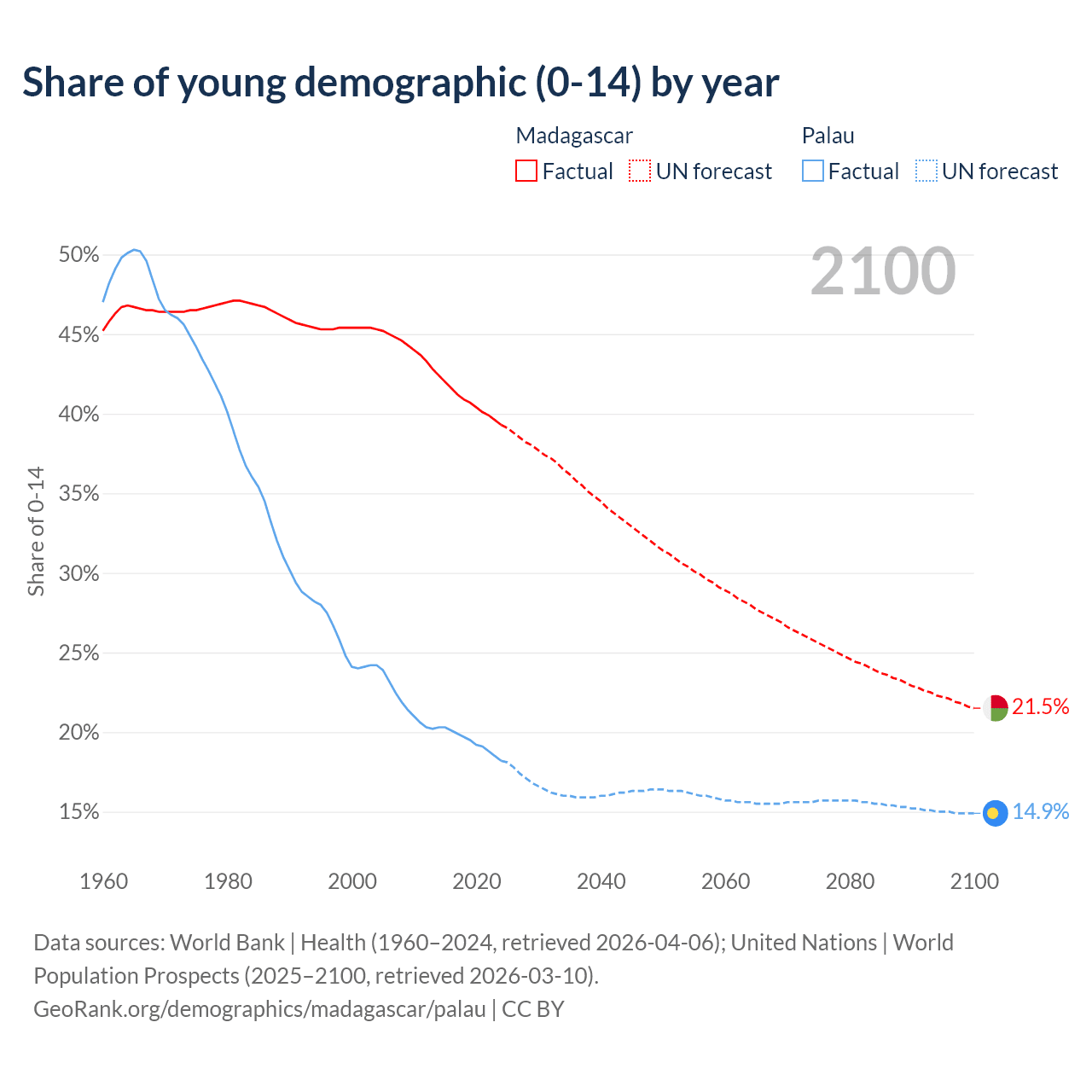 - The share of young demographic (0-15 years old) in Madagascar is 39.3% vs 18.2% in Palau.
