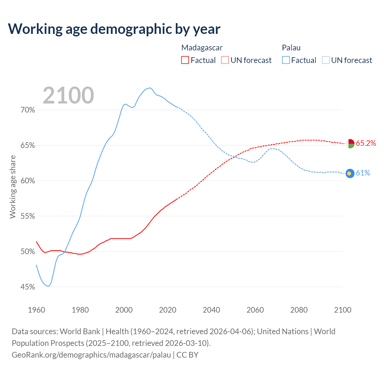 - Madagascar has 19.4M working age adults (aged 15-64) vs 12.4K in Palau.