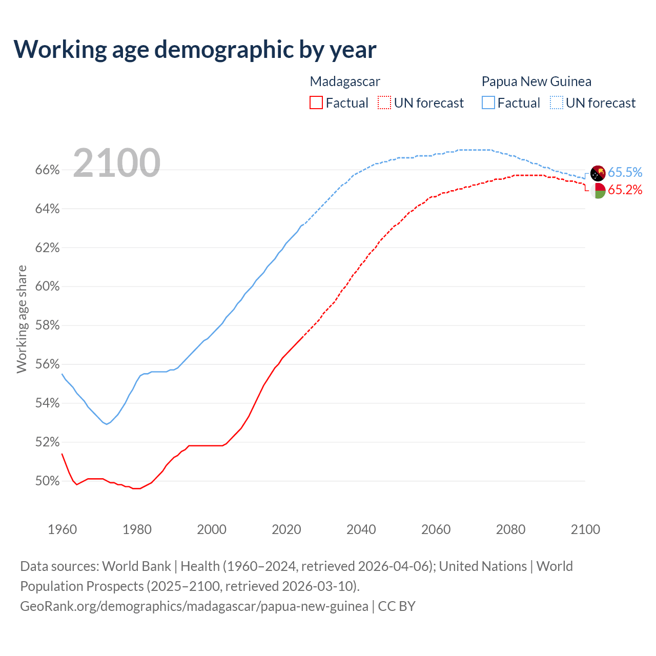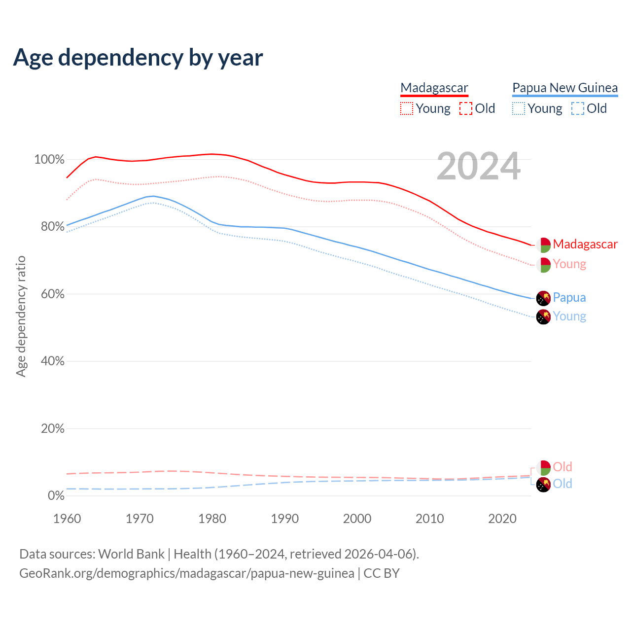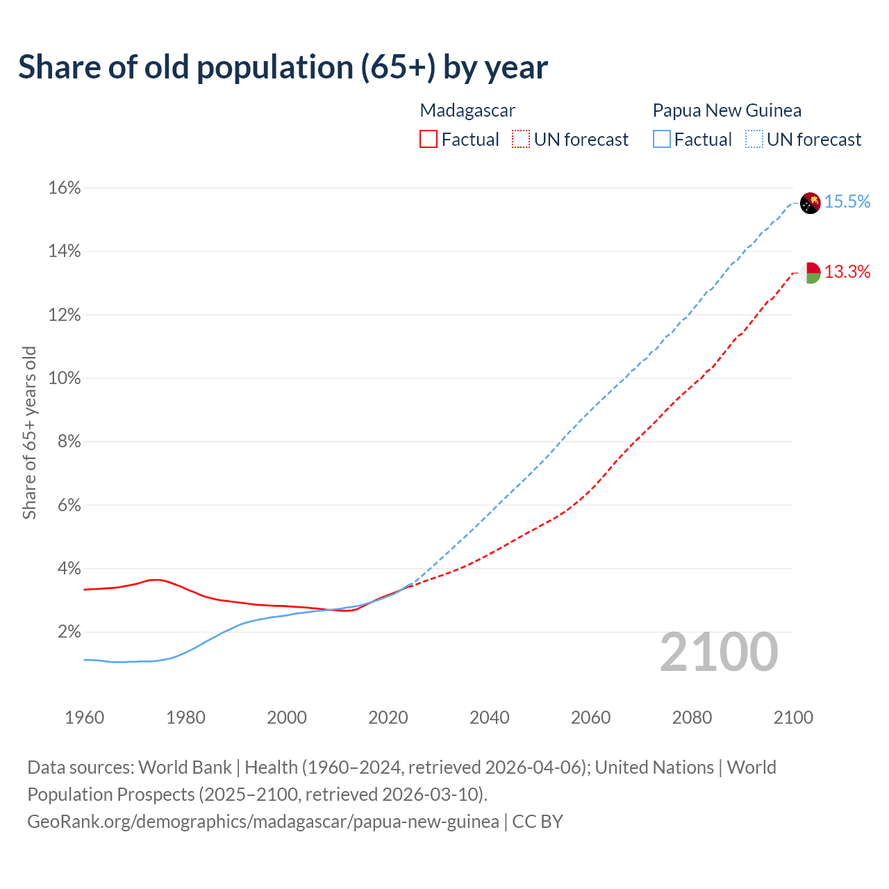 - The share of old-age demographic (65+) in Madagascar is 3.41% vs 3.46% in Papua New Guinea.
