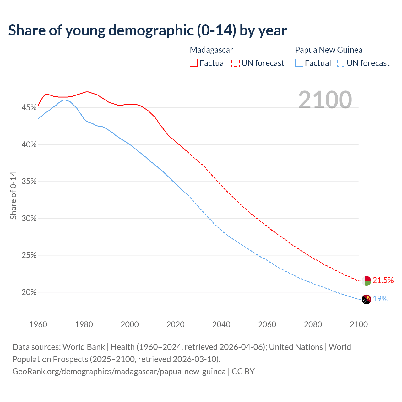 - The share of young demographic (0-15 years old) in Madagascar is 39.3% vs 33.5% in Papua New Guinea.