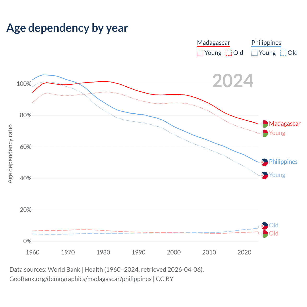 Data sources: World Bank | Health (1960–2024, retrieved 2026-04-06); U.S. Census Bureau (1960–2024, retrieved 2026-02-08).