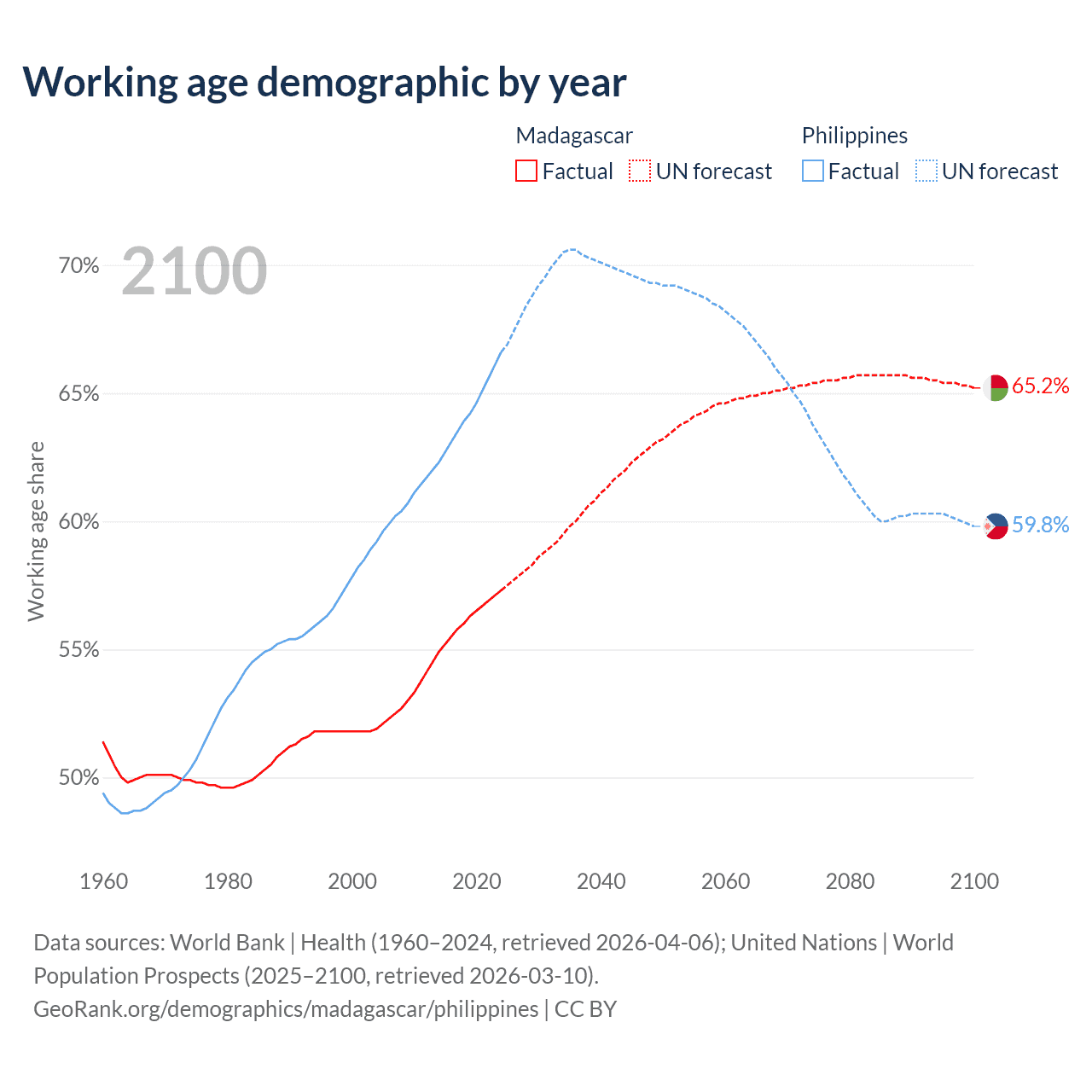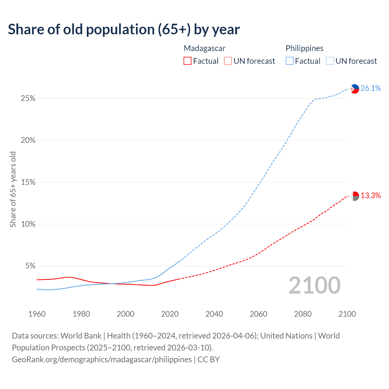 The share of older people aged 65 and over is 3.41% in Madagascar and 5.49% in the Philippines. Life expectancy in Madagascar compared to the Philippines .