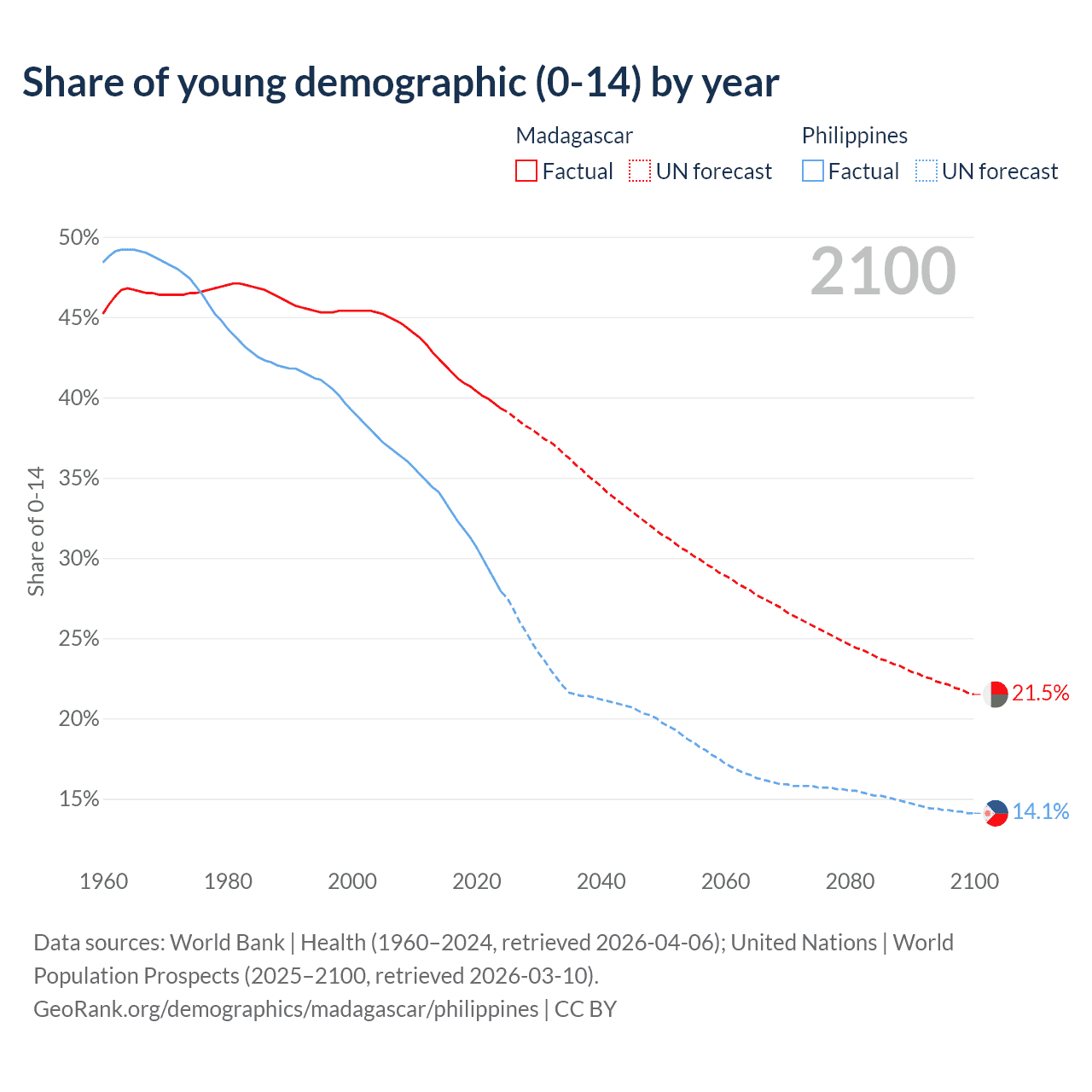 - The share of young demographic (0-15 years old) in Madagascar is 39.3% vs 27.9% in the Philippines.