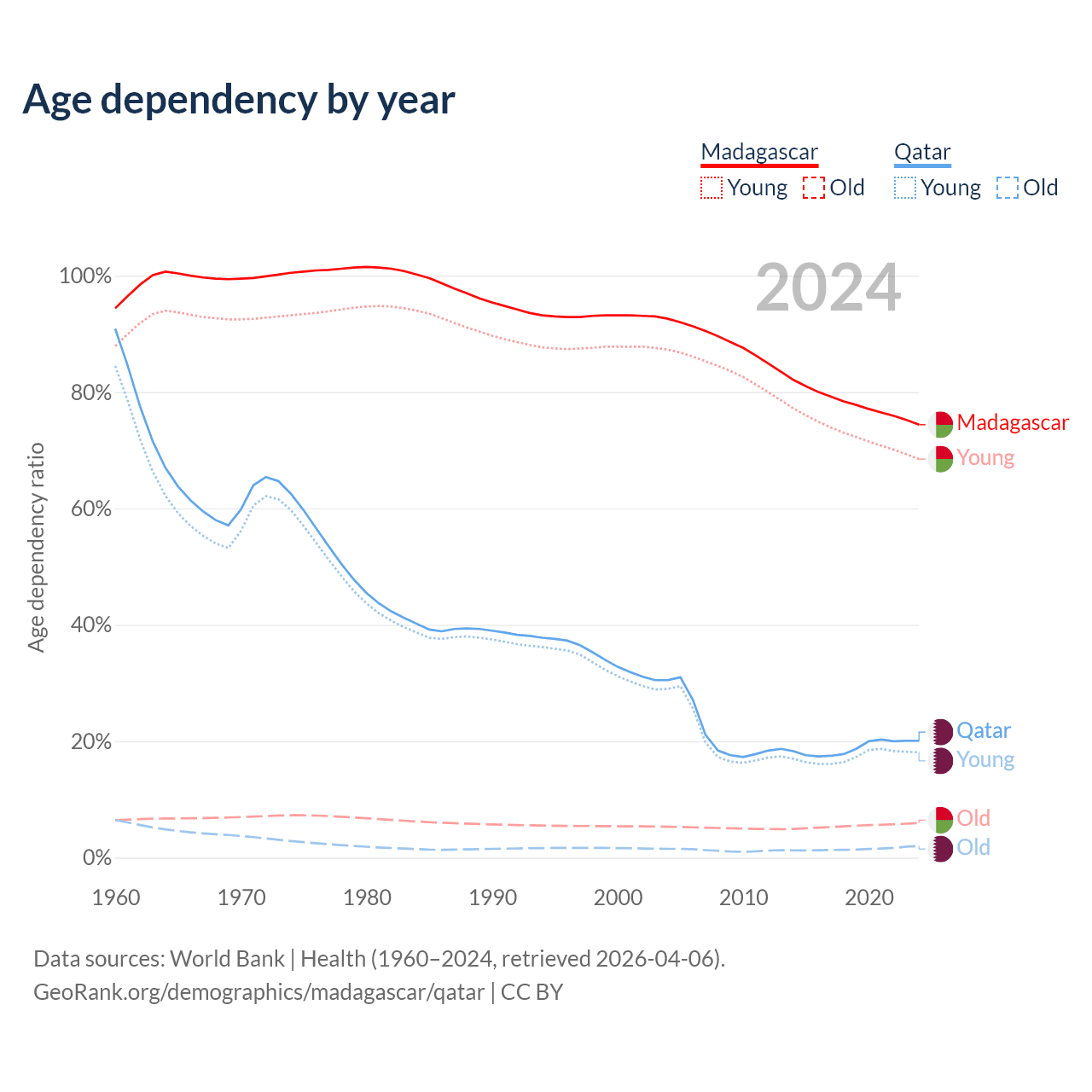- Madagascar is ranked 165/196 by median age (oldest to youngest) vs 78/196 for Qatar.