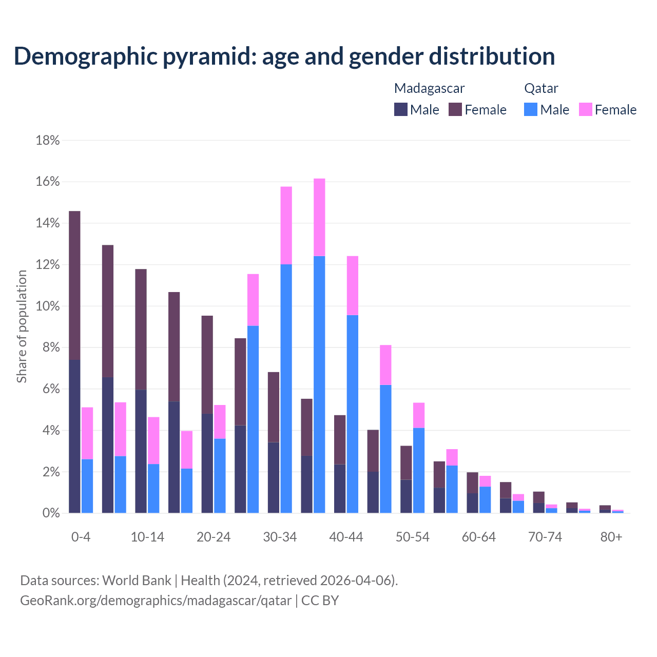 - As of 2026, the population of Madagascar is 33.8M vs 3M in Qatar - 11.3 times difference.