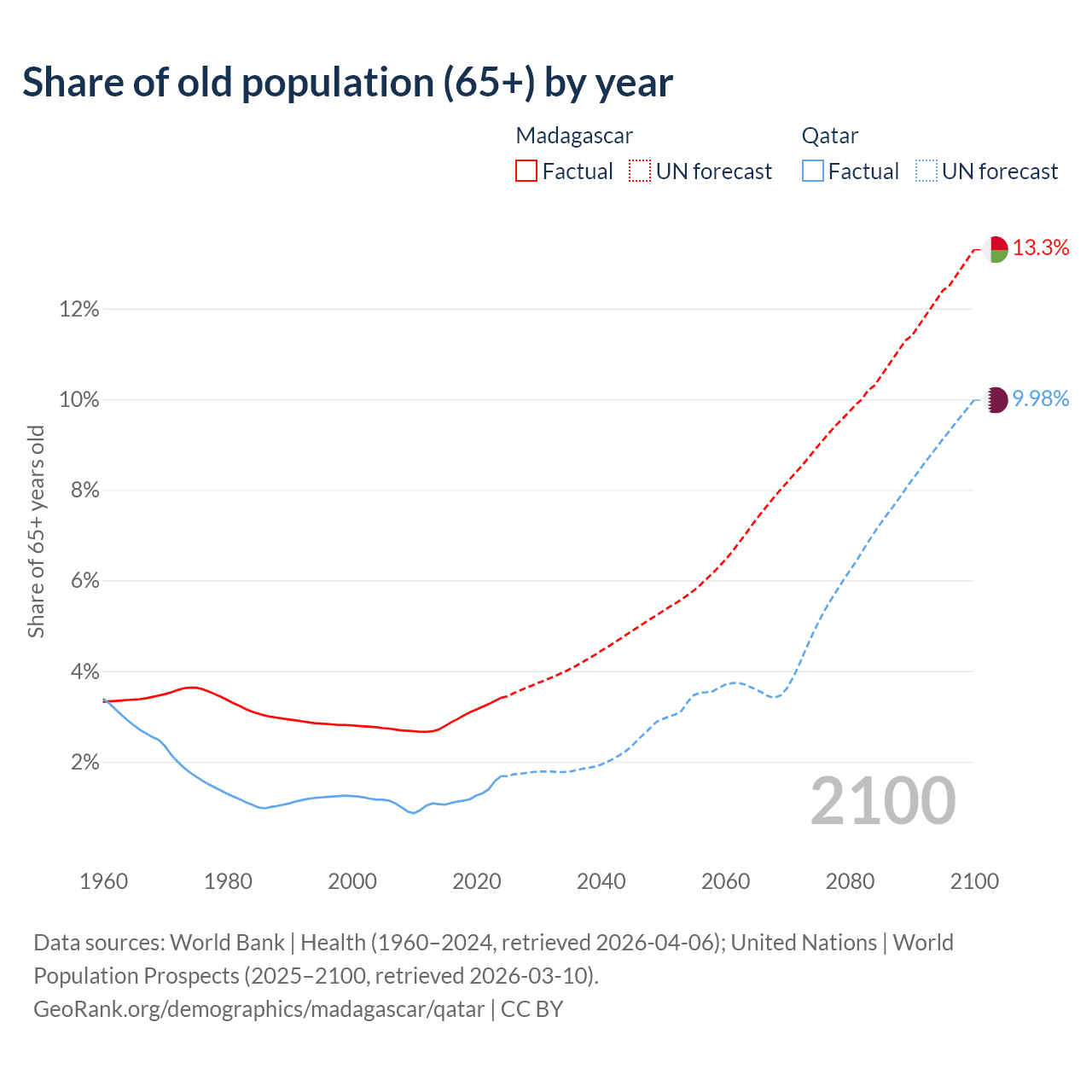 The share of older people aged 65 and over is 3.41% in Madagascar and 1.68% in Qatar. Life expectancy in Madagascar compared to Qatar .