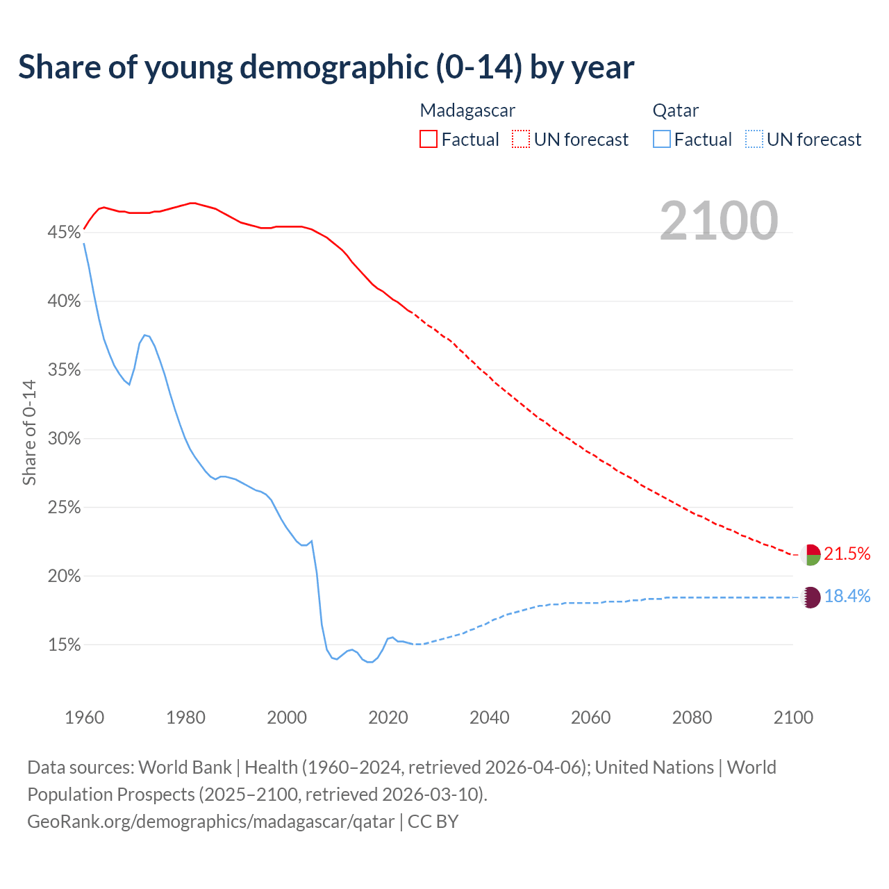 - The share of young demographic (0-15 years old) in Madagascar is 39.3% vs 15.1% in Qatar.