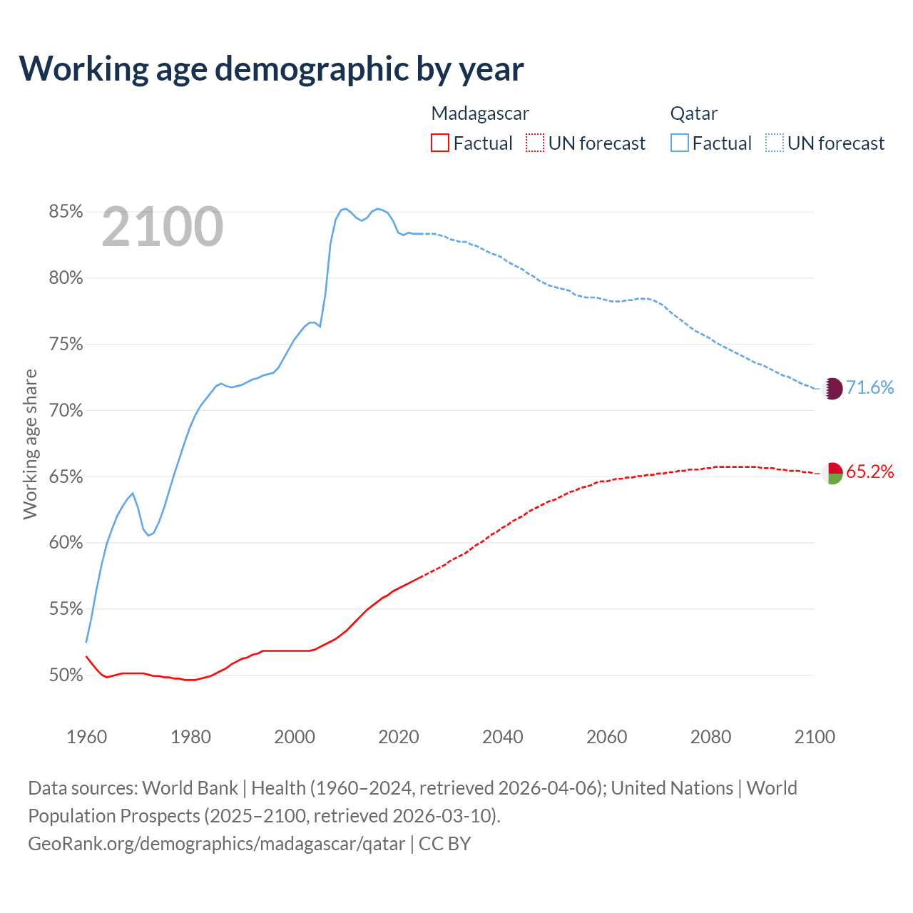 - Madagascar has 19.4M working age adults (aged 15-64) vs 2.5M in Qatar.