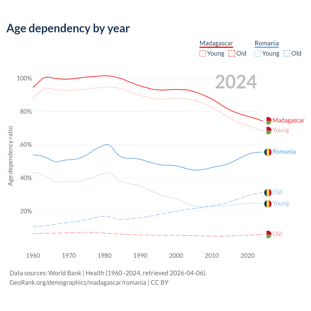 - The share of old-age demographic (65+) in Madagascar is 3.41% vs 20% in Romania.