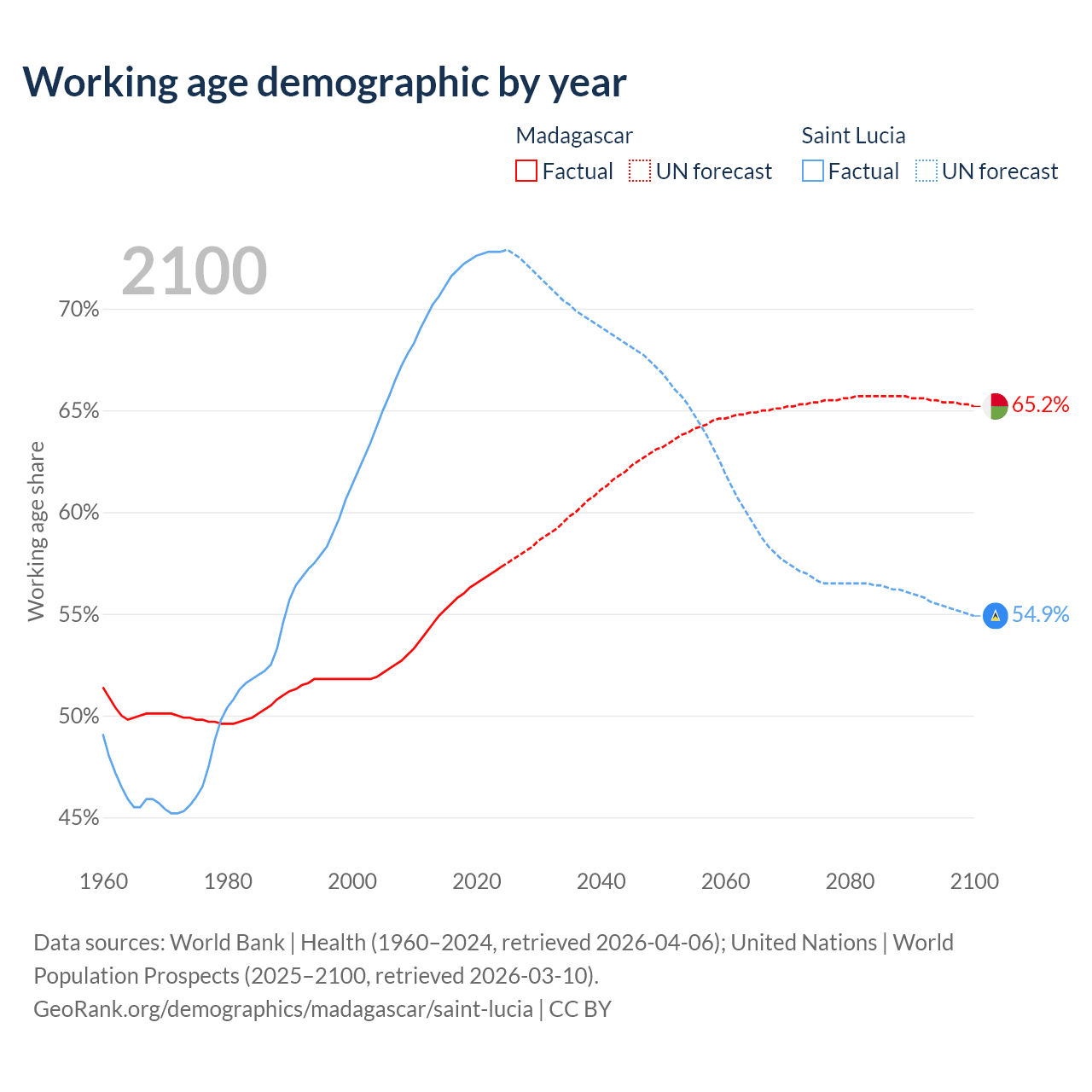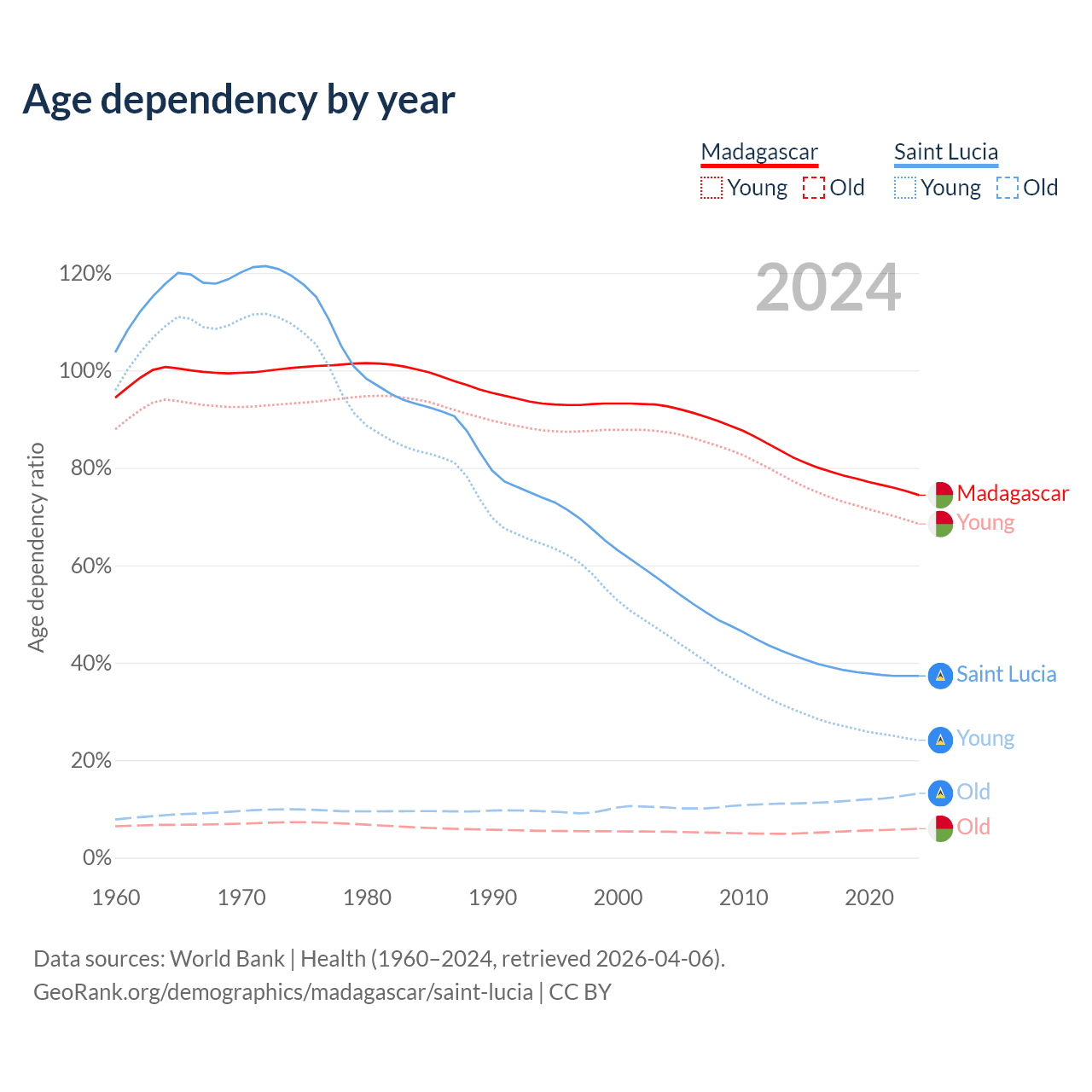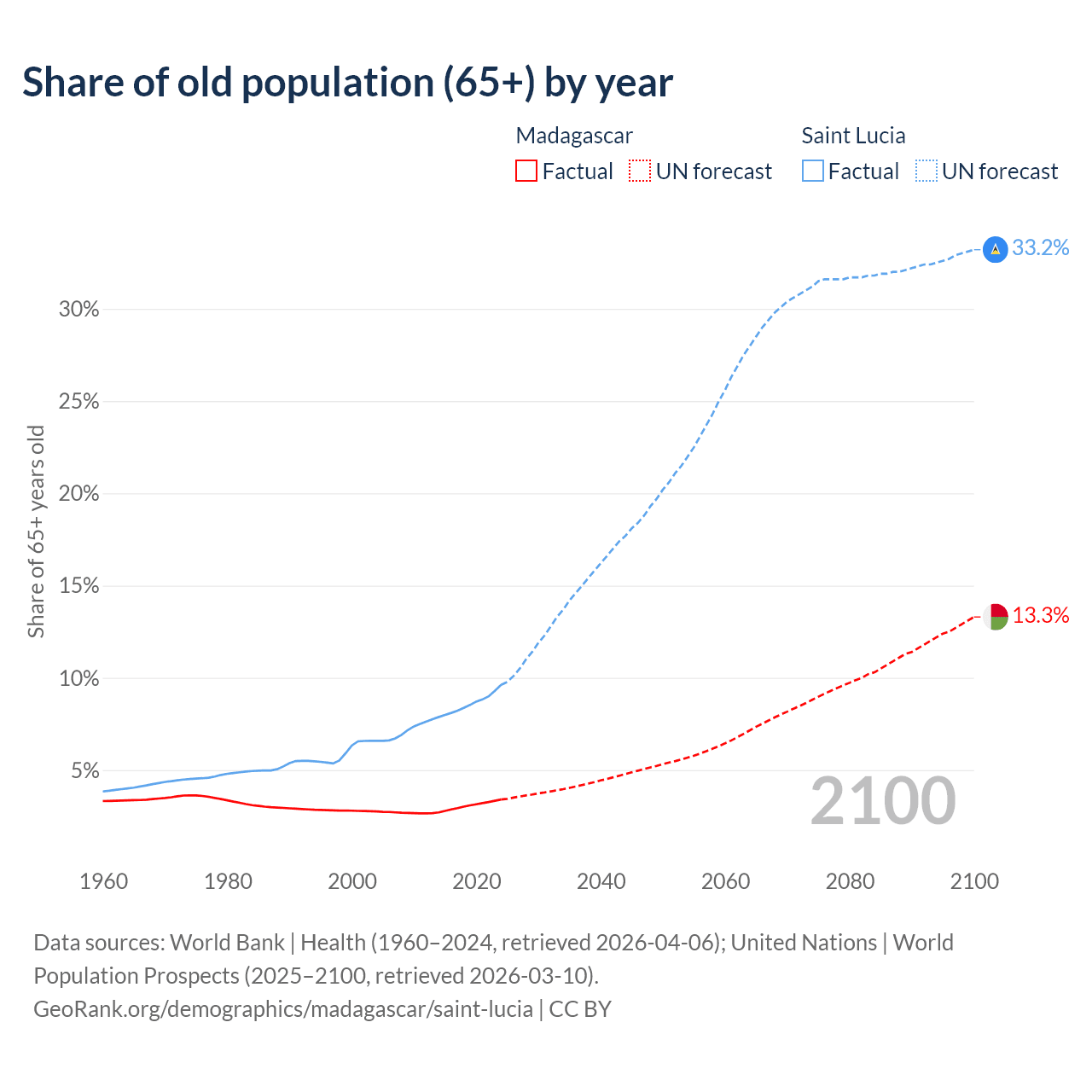 - The share of old-age demographic (65+) in Madagascar is 3.41% vs 9.62% in Saint Lucia.