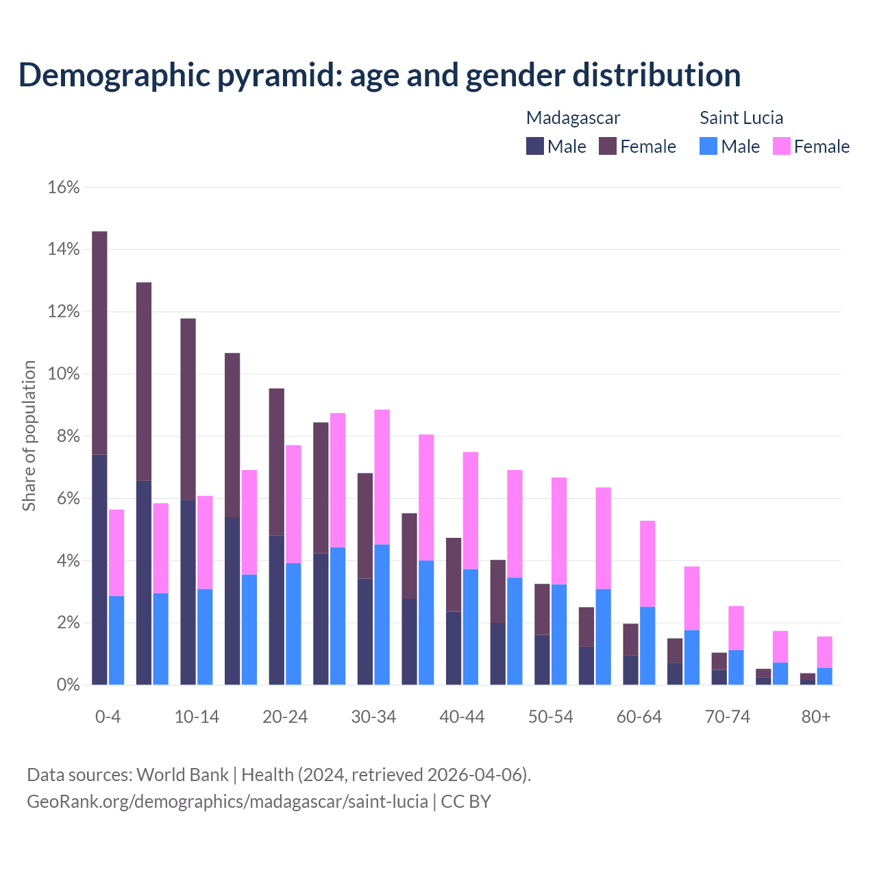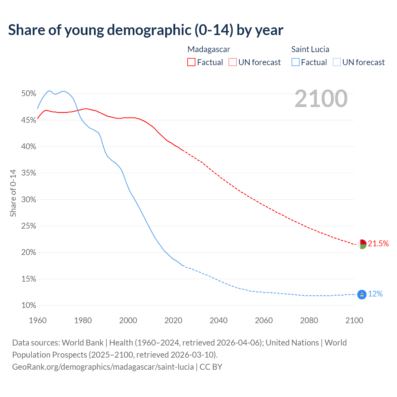 - The share of young demographic (0-15 years old) in Madagascar is 39.3% vs 17.5% in Saint Lucia.