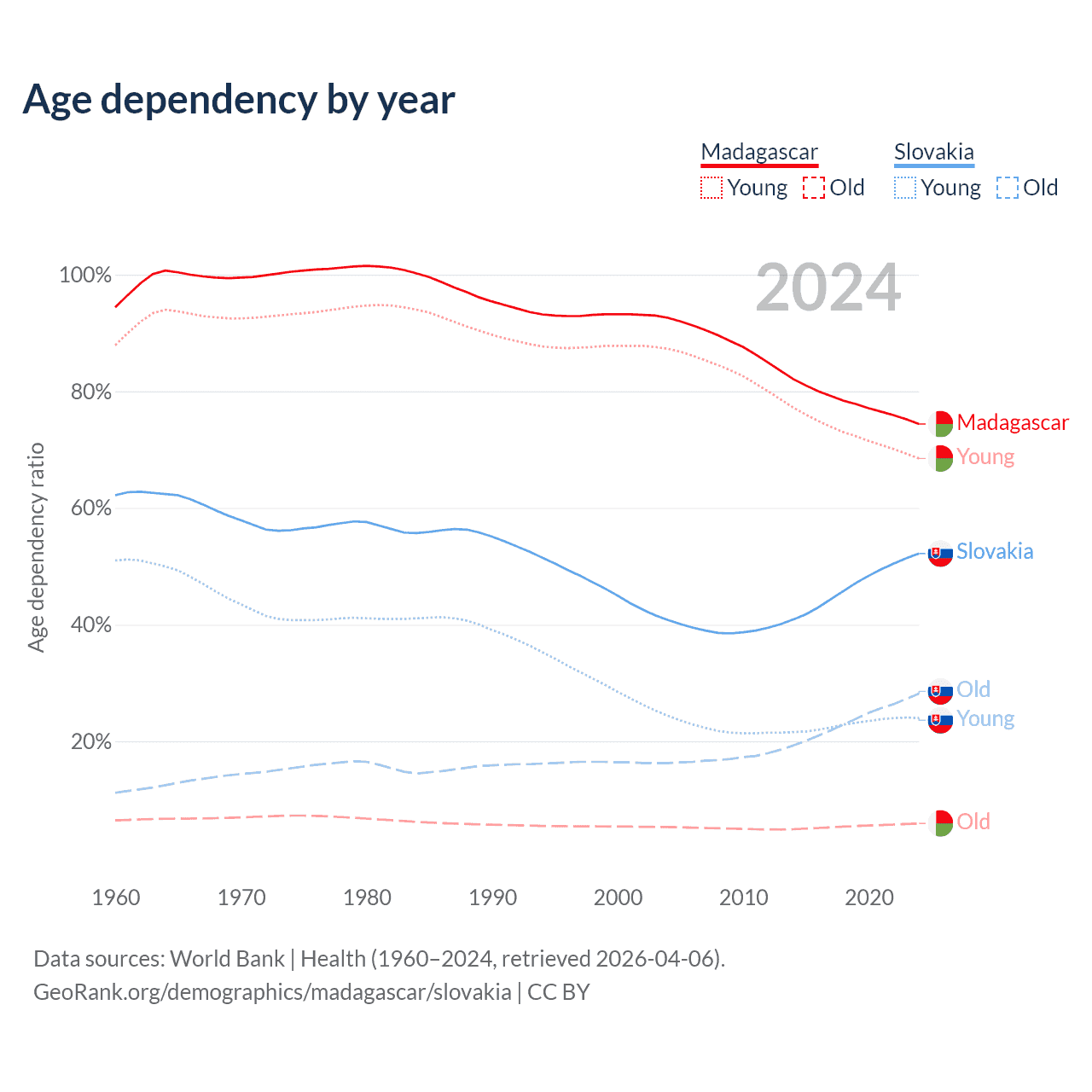 - The share of young demographic (0-15 years old) in Madagascar is 39.3% vs 15.8% in Slovakia.
