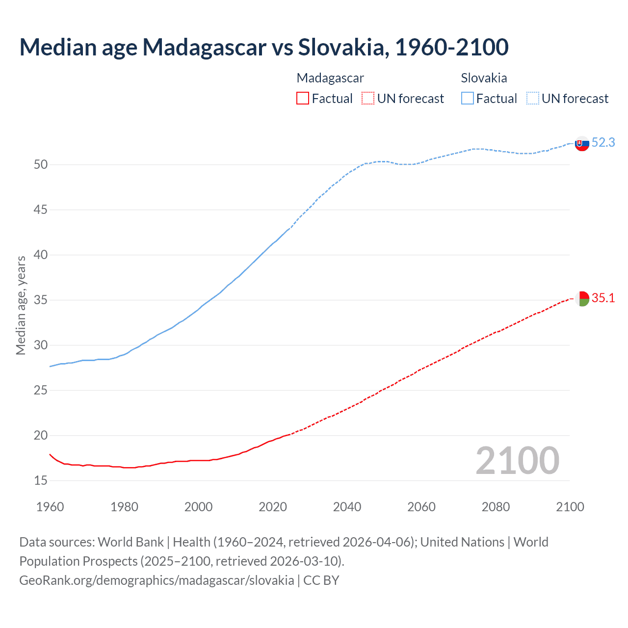 Median age Madagascar vs Slovakia, 1960-2100