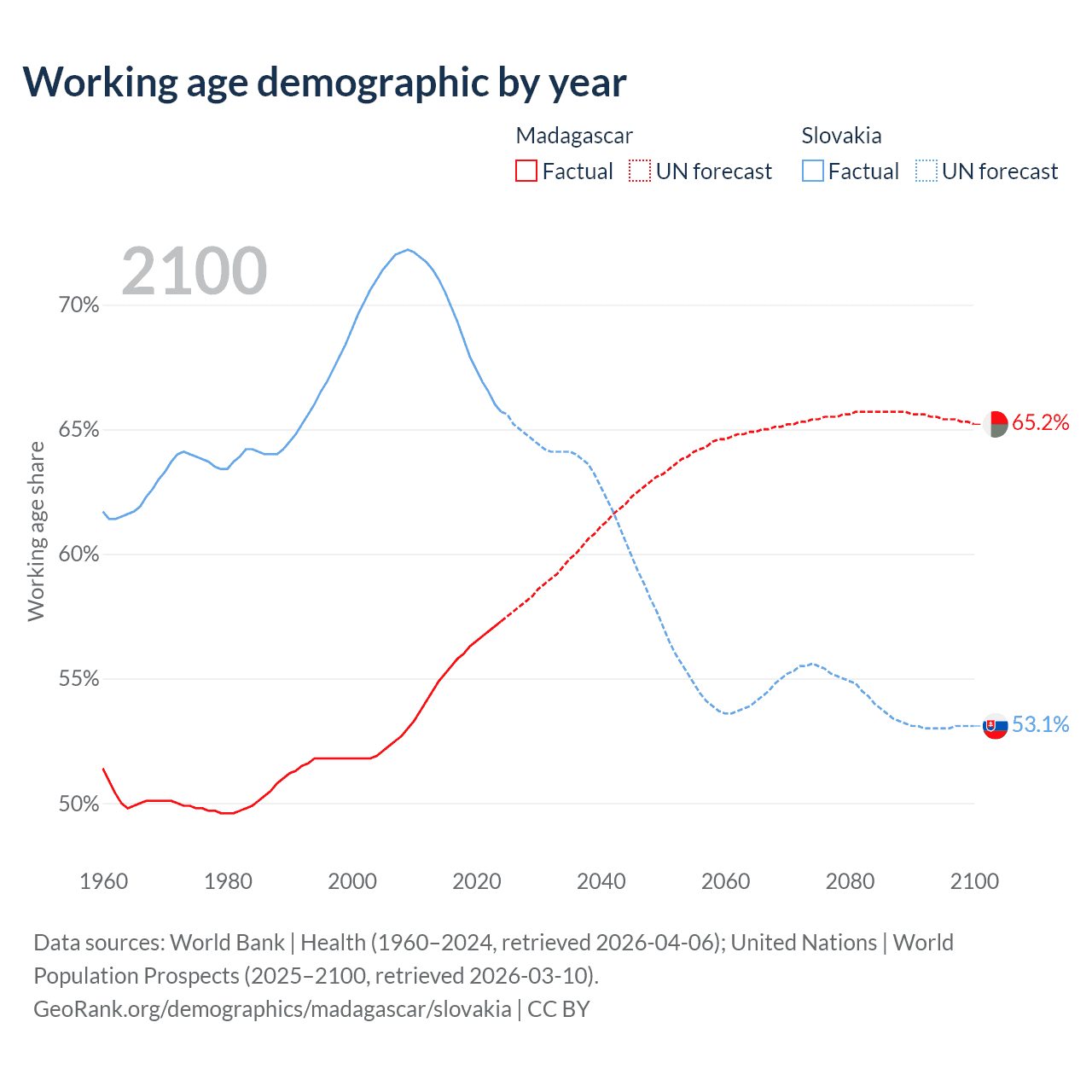 The share of older people aged 65 and over is 3.41% in Madagascar and 18.5% in Slovakia. Life expectancy in Madagascar compared to Slovakia .