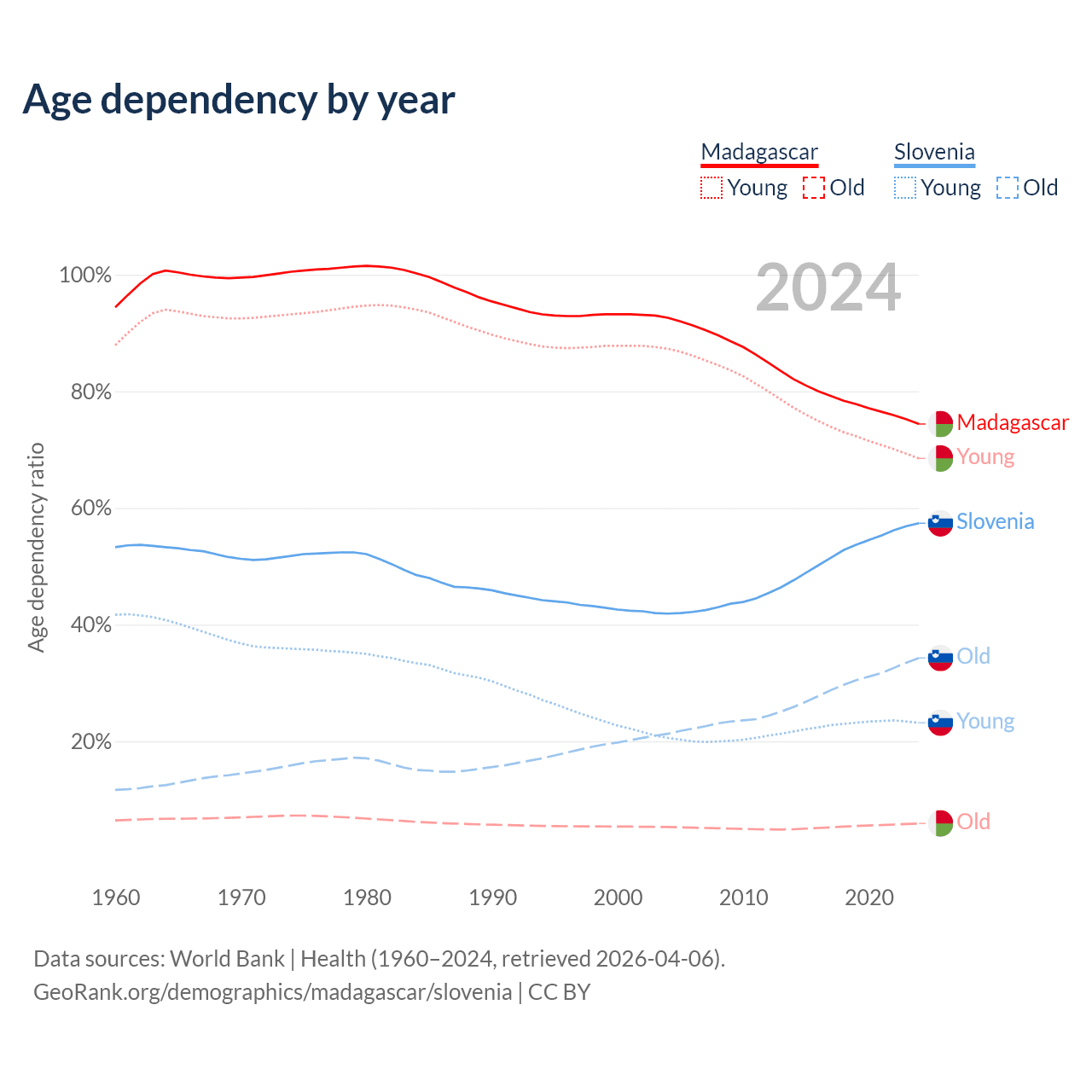 - The share of old-age demographic (65+) in Madagascar is 3.41% vs 21.8% in Slovenia.