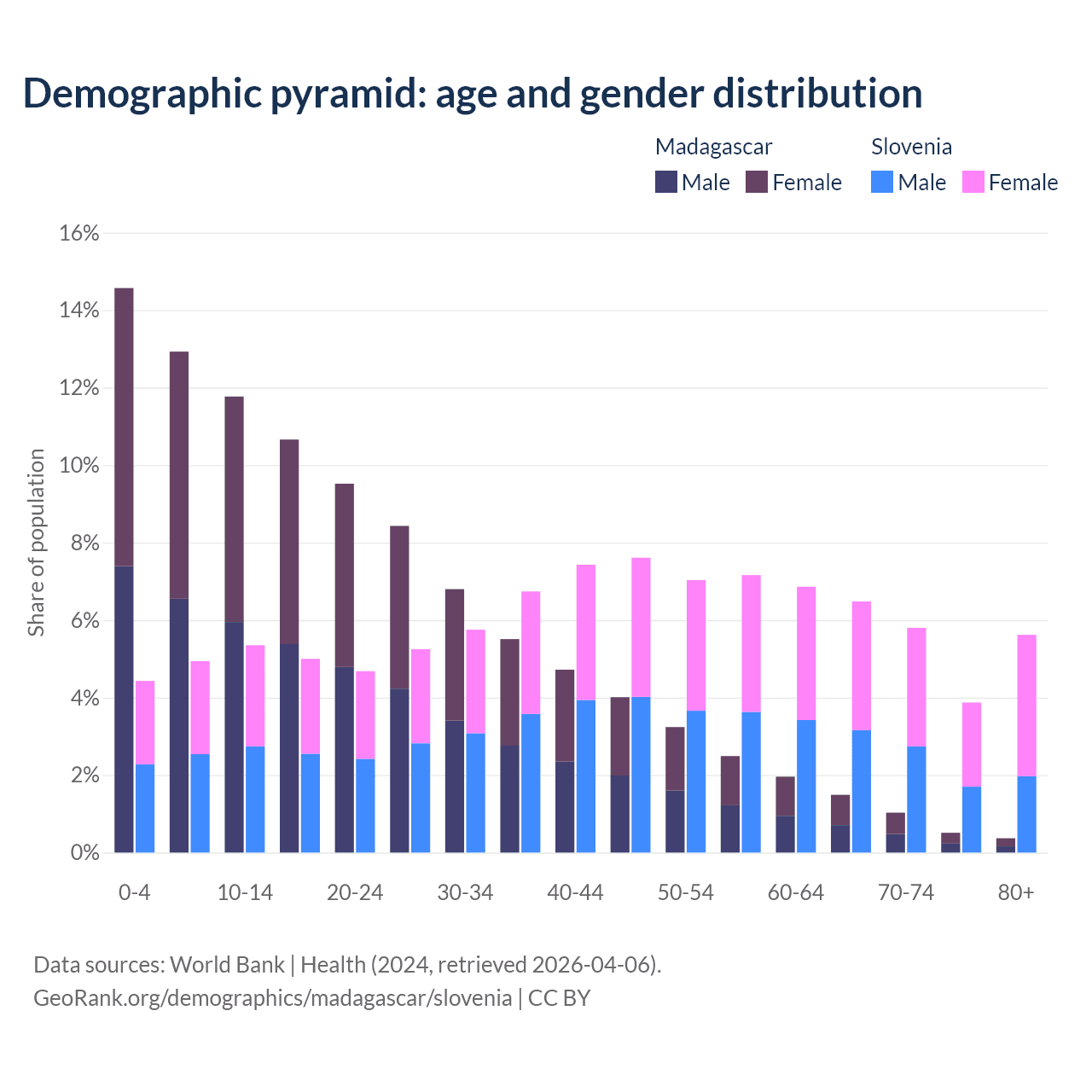 - As of 2026, the population of Madagascar is 33.8M vs 2.12M in Slovenia - 15.9 times difference.