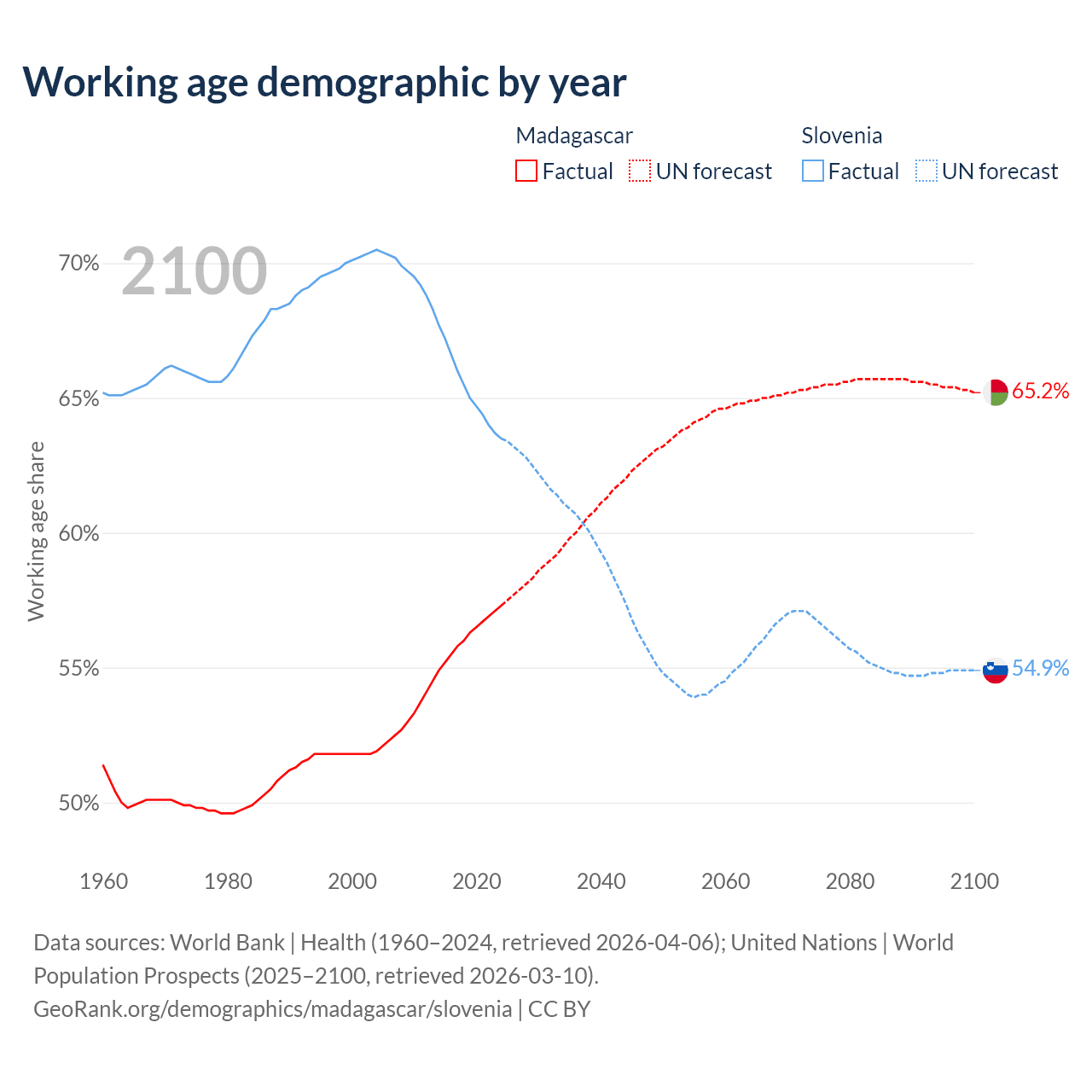- Madagascar has 19.4M working age adults (aged 15-64) vs 1.35M in Slovenia.