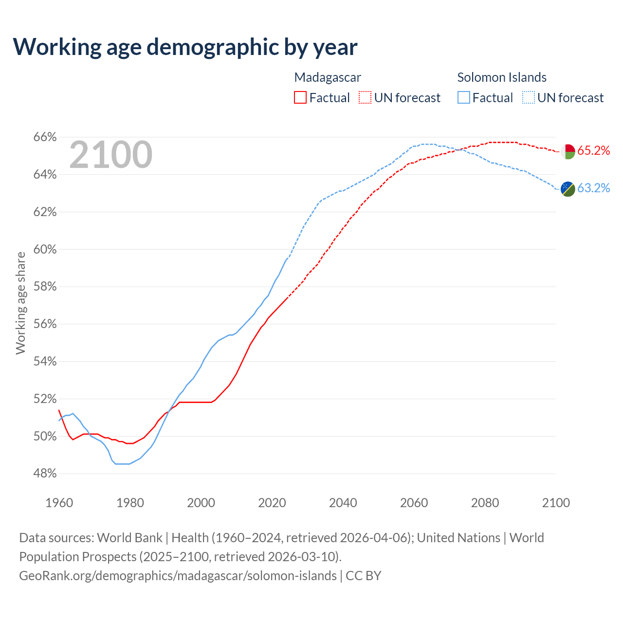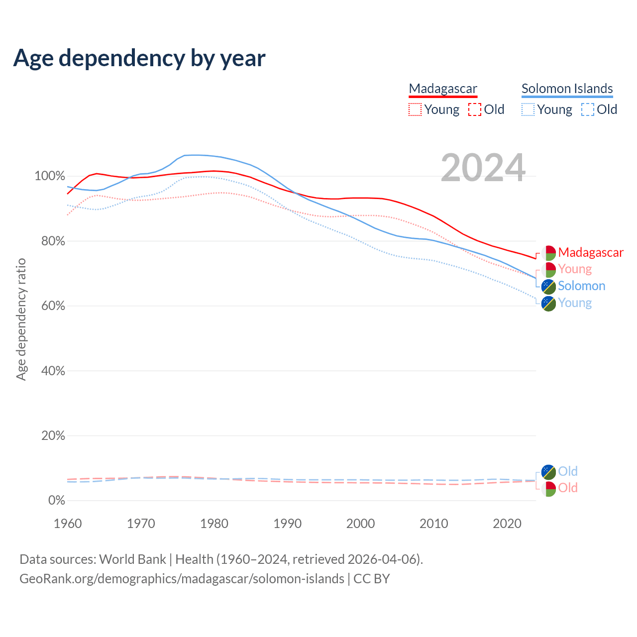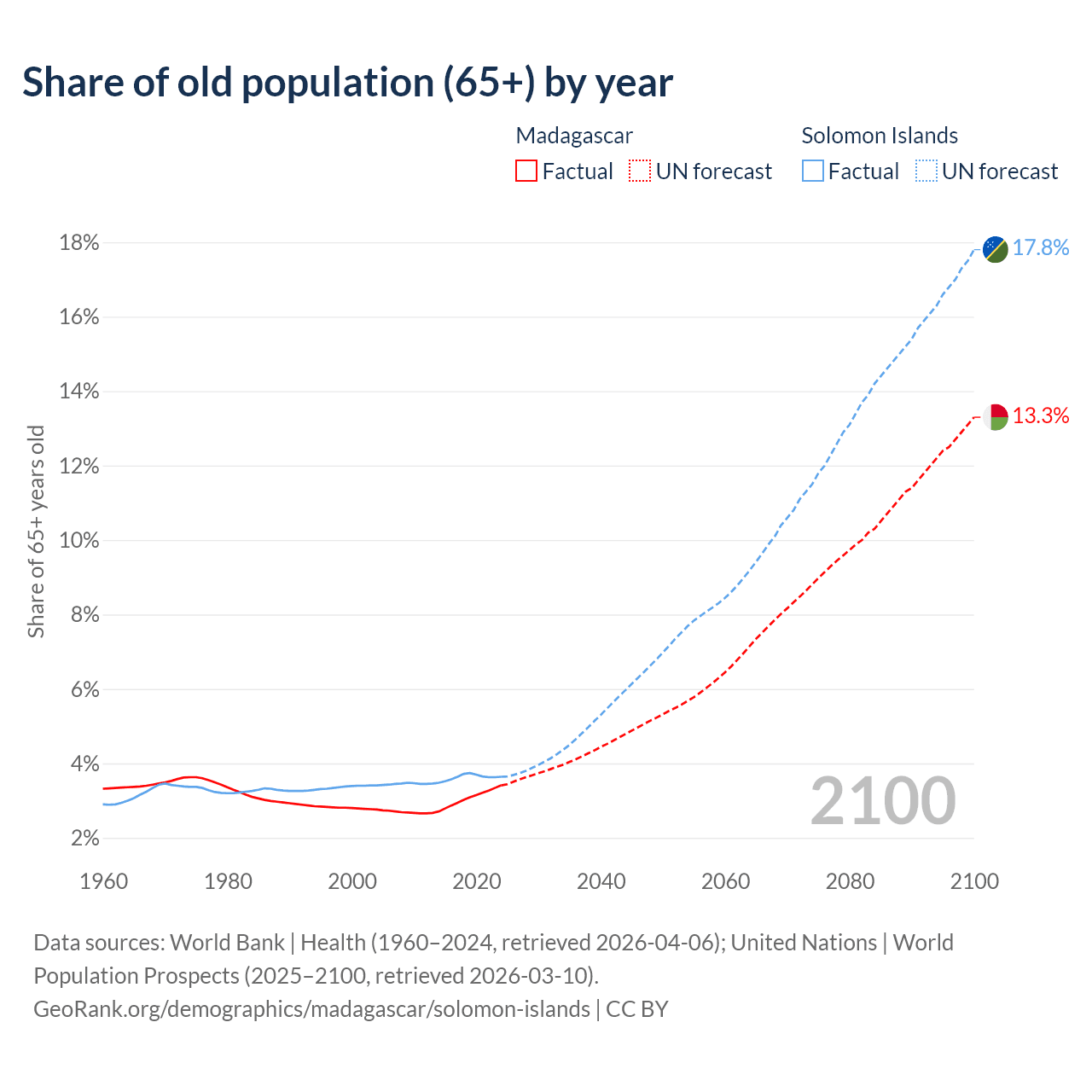The share of older people aged 65 and over is 3.41% in Madagascar and 3.64% in the Solomon Islands. Life expectancy in Madagascar compared to the Solomon Islands .