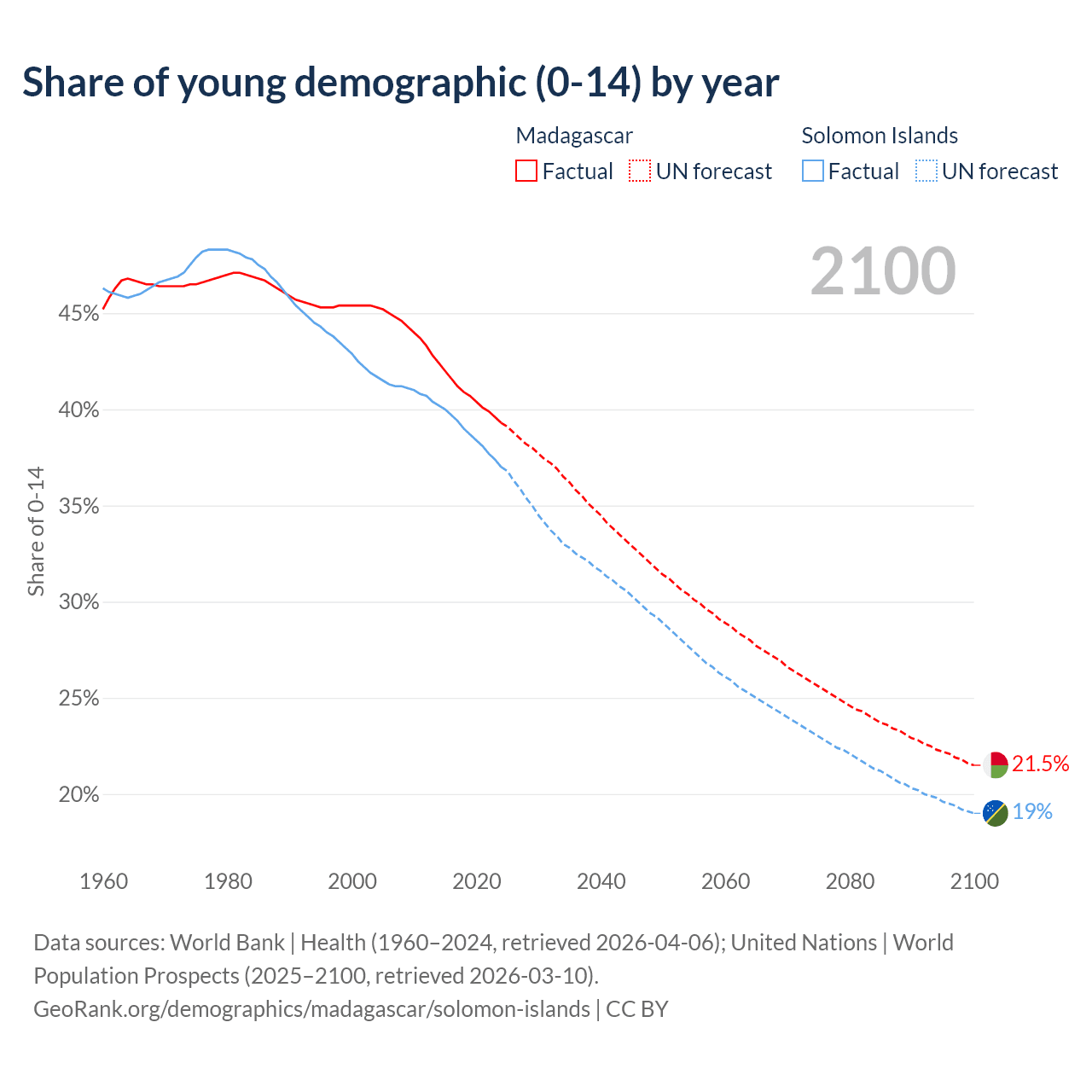 Median age Madagascar vs Solomon Islands, 1960-2100