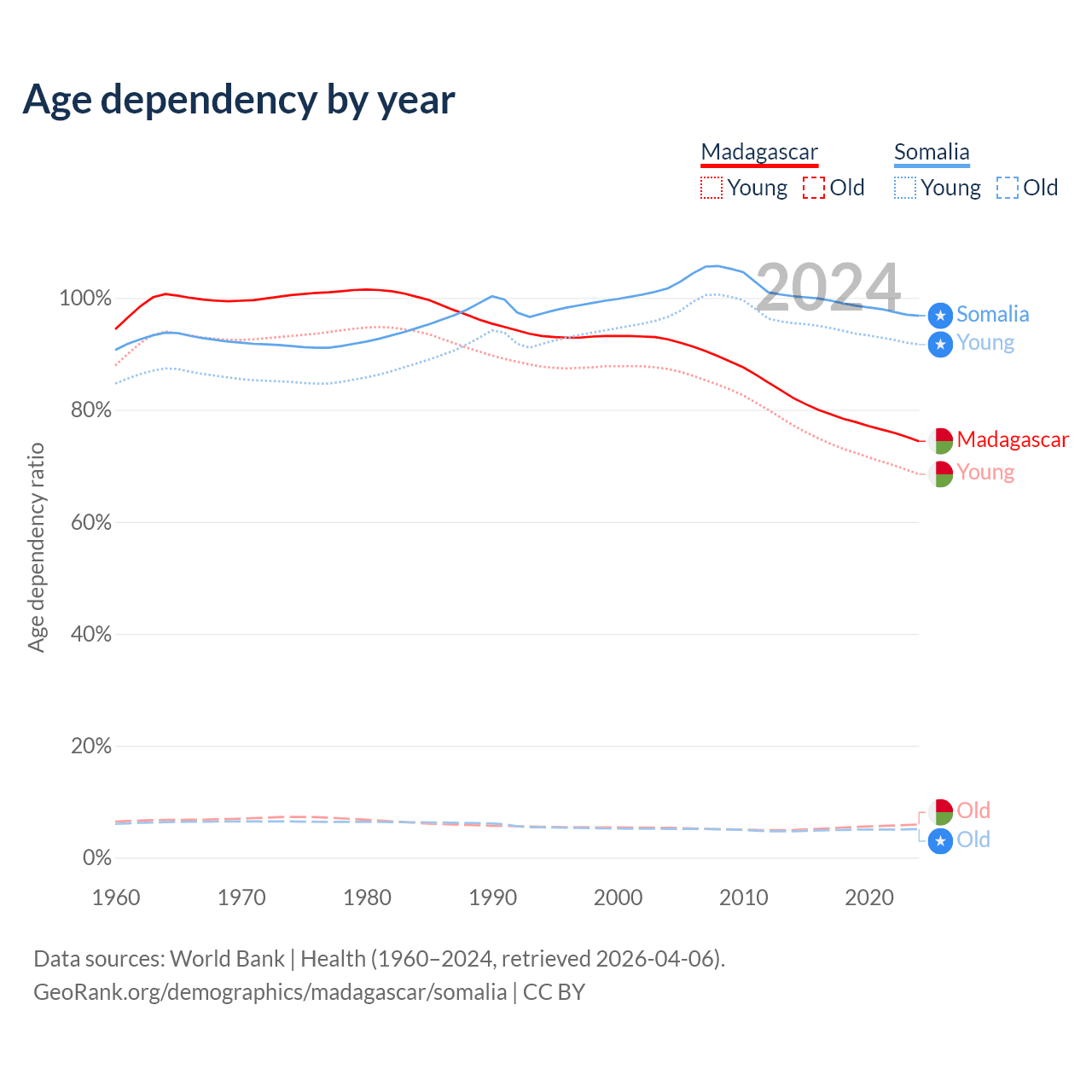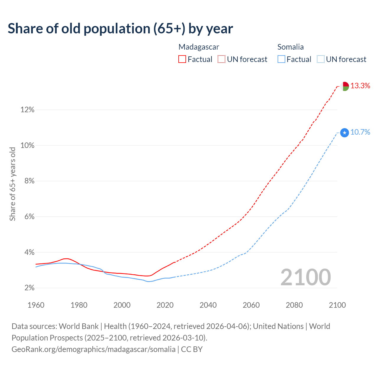 - The share of old-age demographic (65+) in Madagascar is 3.41% vs 2.59% in Somalia.