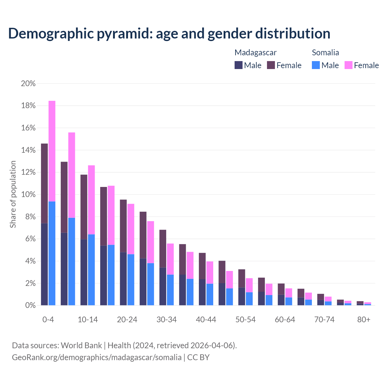 - Madagascar is ranked 165/196 by median age (oldest to youngest) vs 194/196 for Somalia.