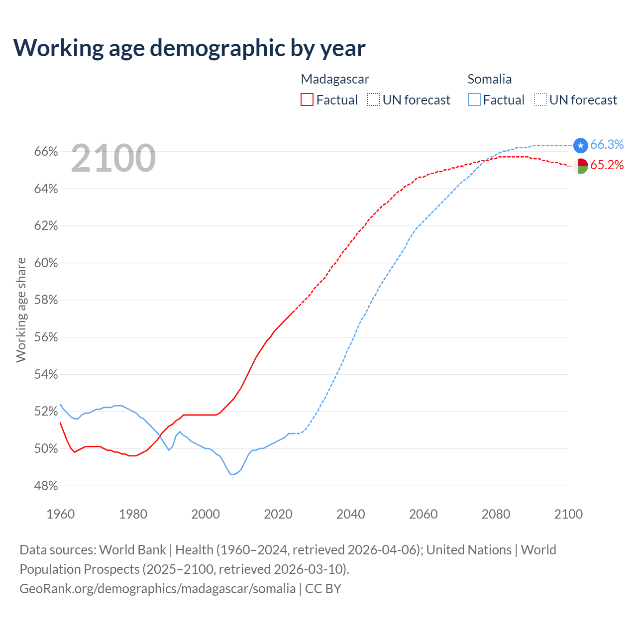 - Madagascar has 19.4M working age adults (aged 15-64) vs 10.4M in Somalia.