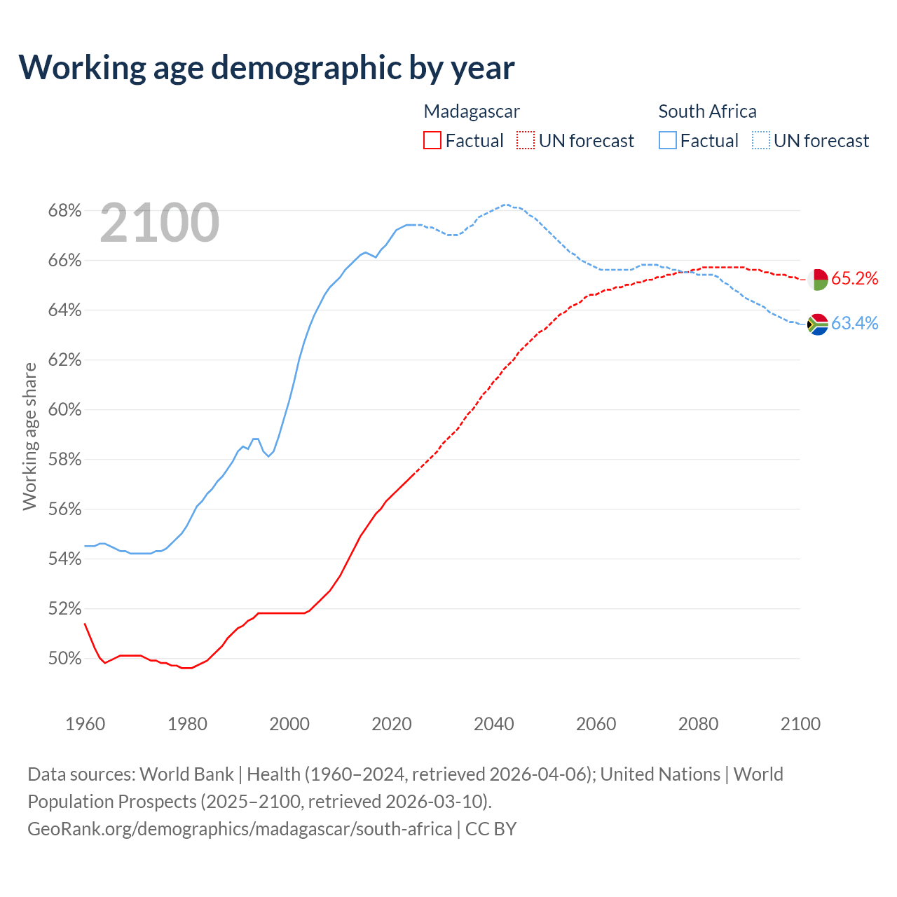 - Madagascar has 19.4M working age adults (aged 15-64) vs 44.3M in South Africa.
