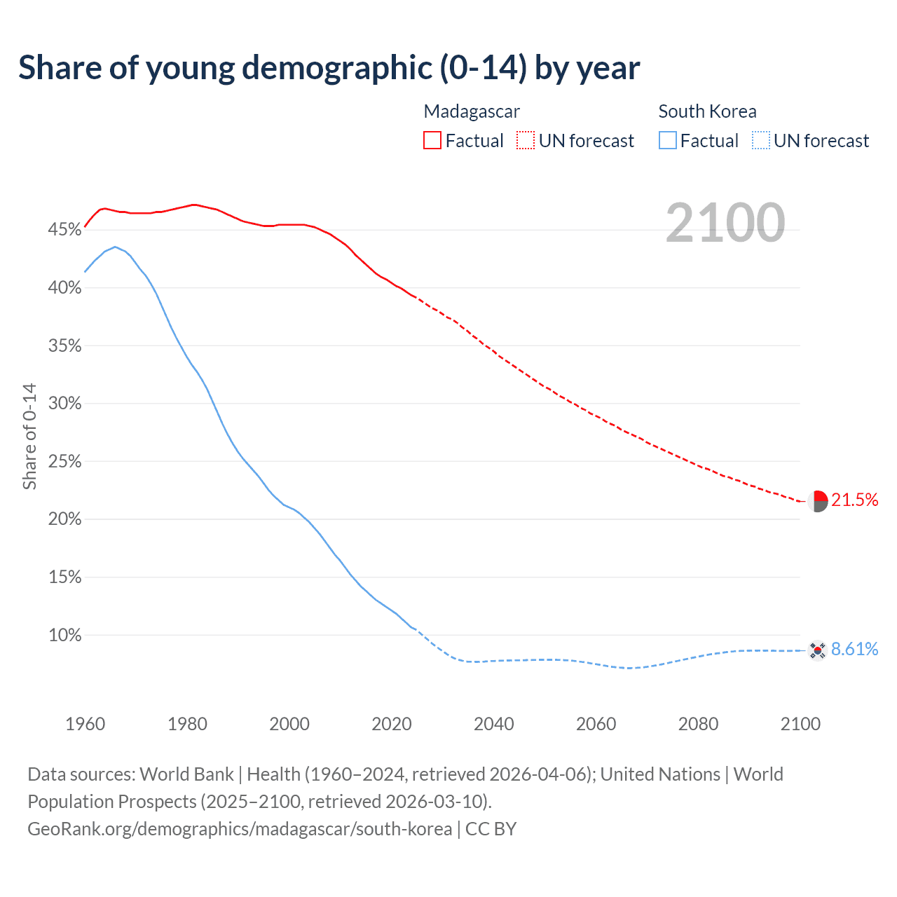 - The share of young demographic (0-15 years old) in Madagascar is 39.3% vs 10.6% in South Korea.