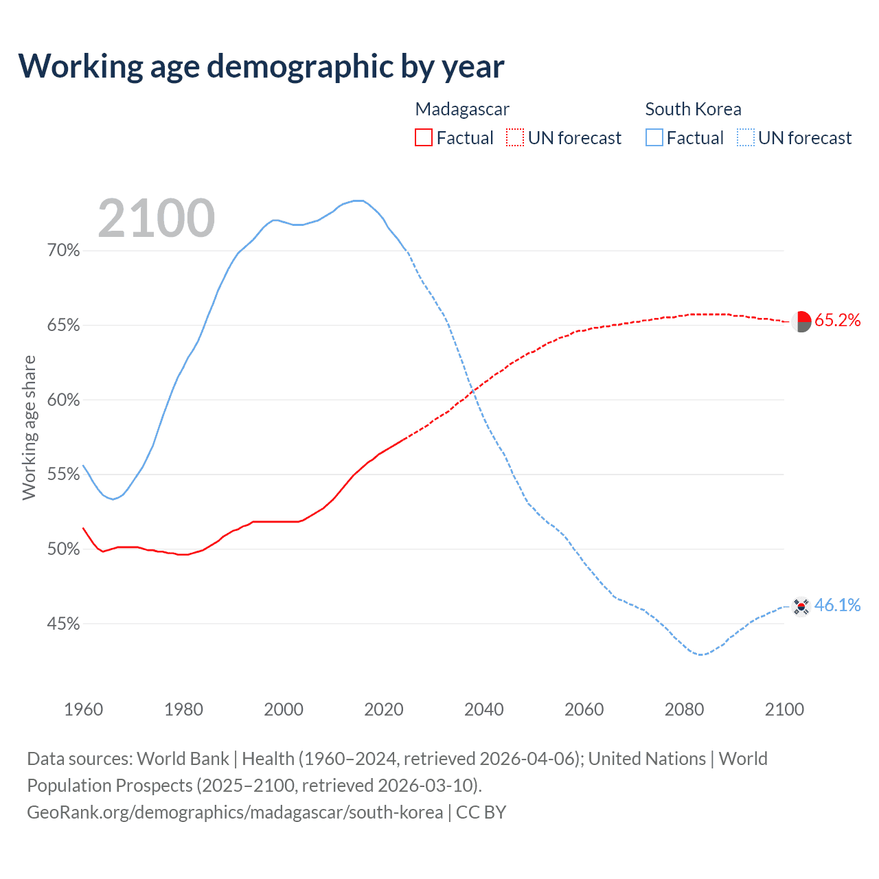 The share of older people aged 65 and over is 3.41% in Madagascar and 19.3% in South Korea. Life expectancy in Madagascar compared to South Korea .