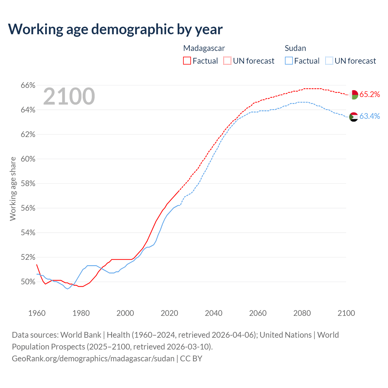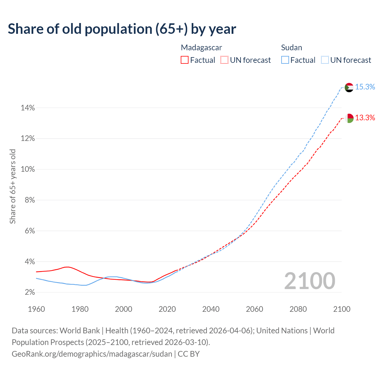 The share of older people aged 65 and over is 3.41% in Madagascar and 3.3% in Sudan. Life expectancy in Madagascar compared to Sudan .