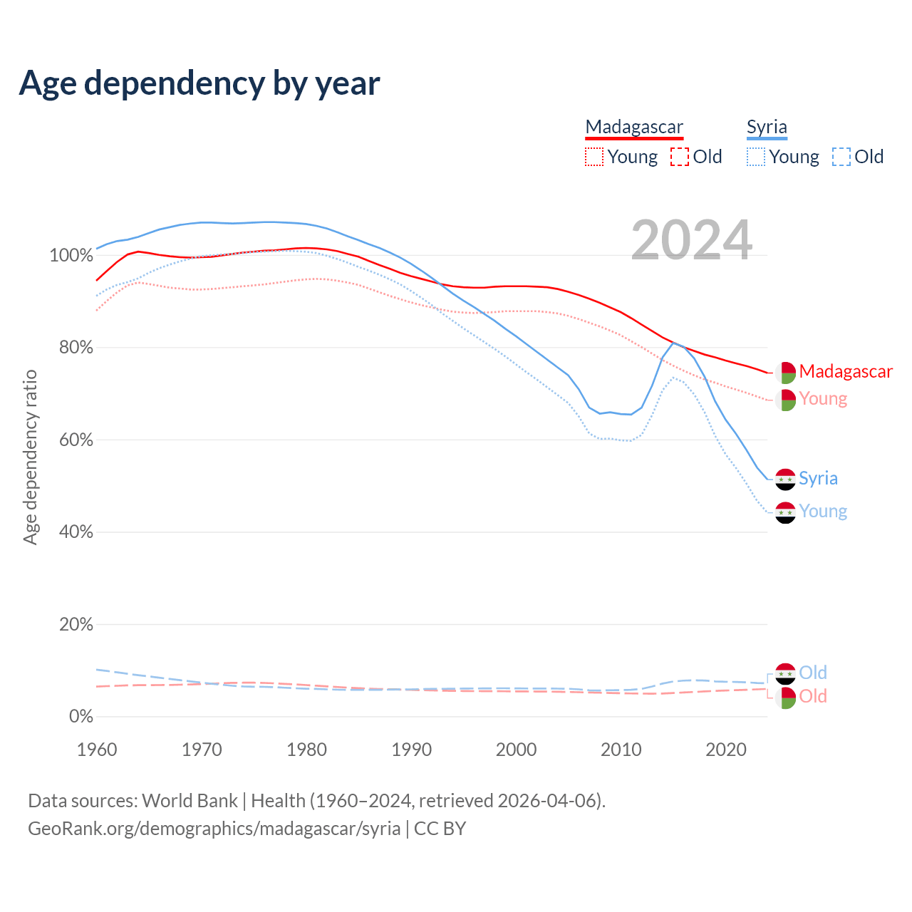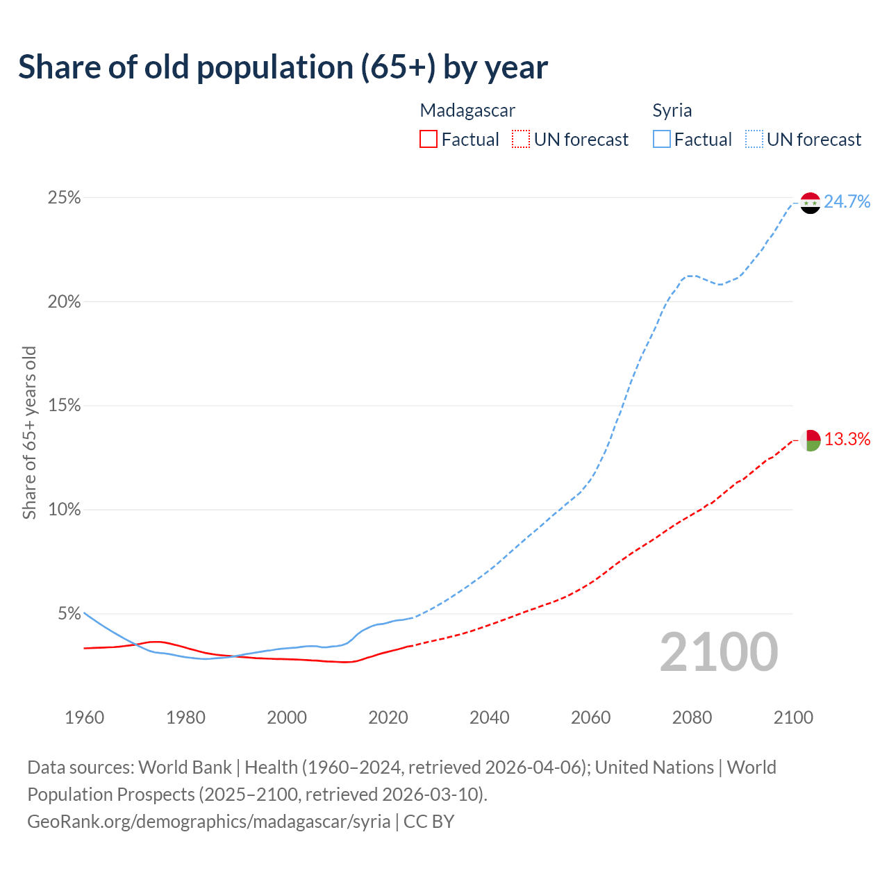 - The share of old-age demographic (65+) in Madagascar is 3.41% vs 4.74% in Syria.