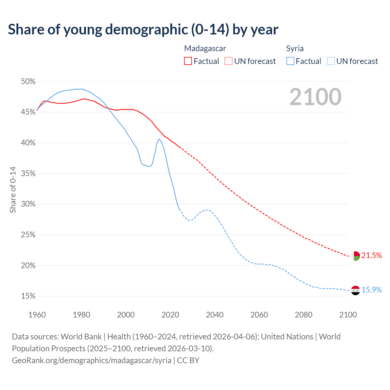 - The share of young demographic (0-15 years old) in Madagascar is 39.3% vs 29.2% in Syria.