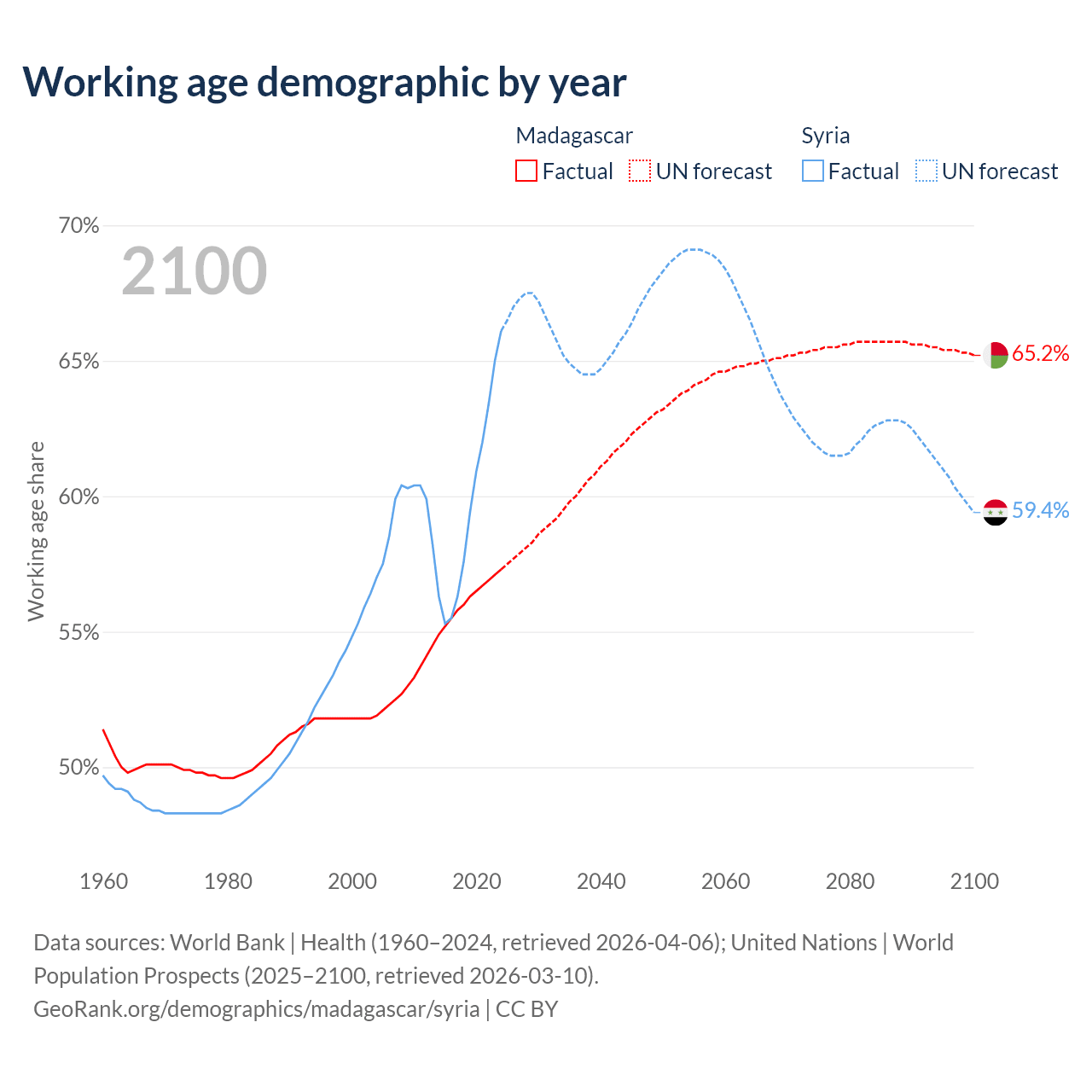 - Madagascar has 19.4M working age adults (aged 15-64) vs 17.7M in Syria.