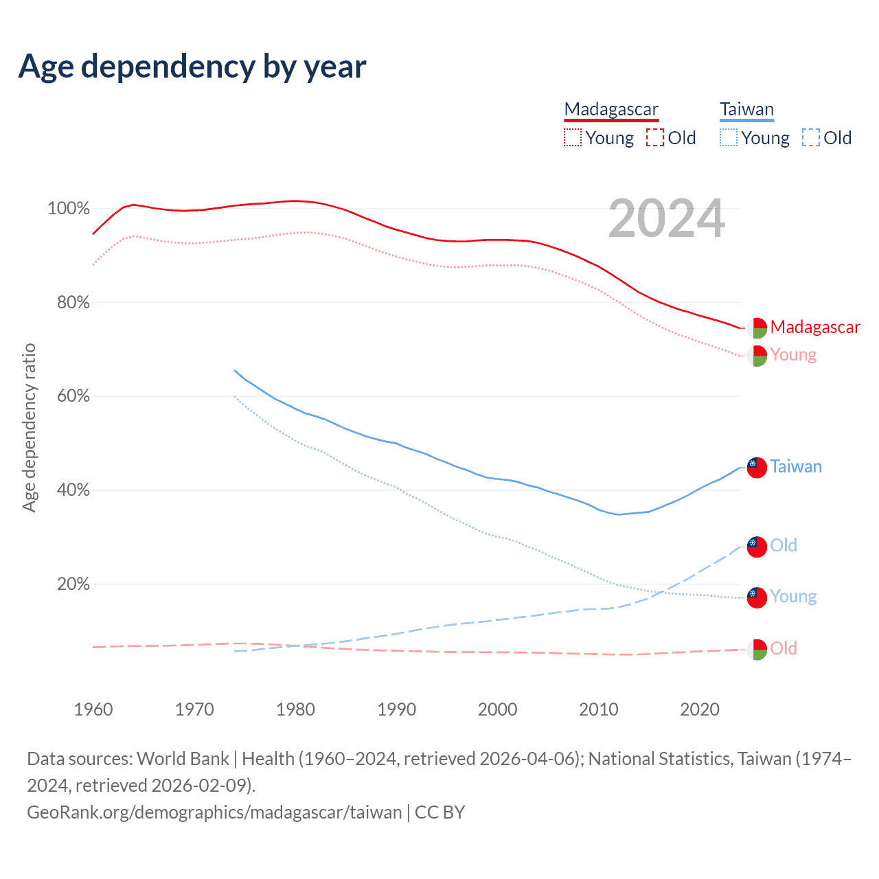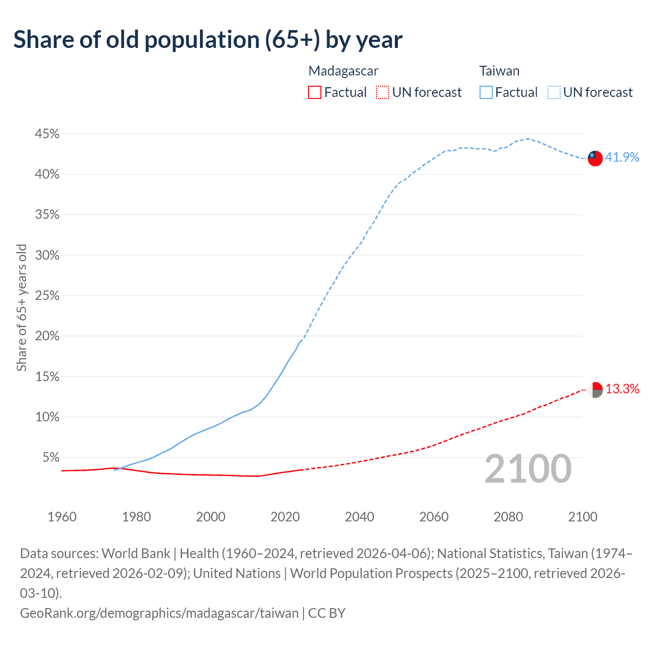 The share of older people aged 65 and over is 3.41% in Madagascar and 19.2% in Taiwan. Life expectancy in Madagascar compared to Taiwan .
