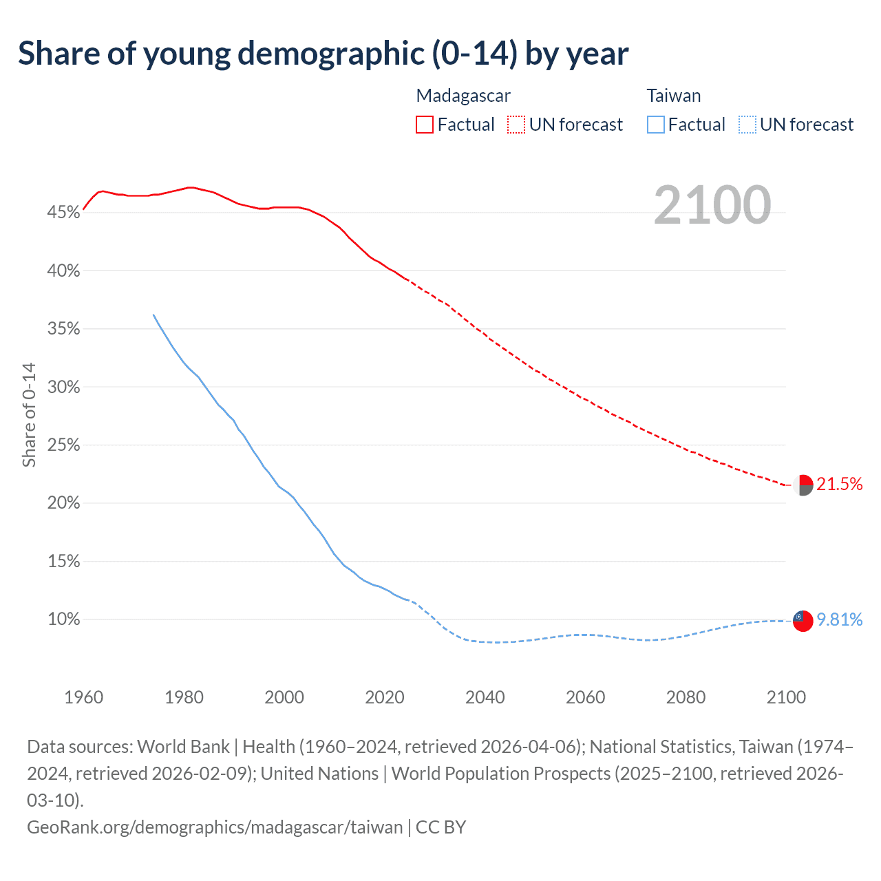 - The share of young demographic (0-15 years old) in Madagascar is 39.3% vs 11.7% in Taiwan.