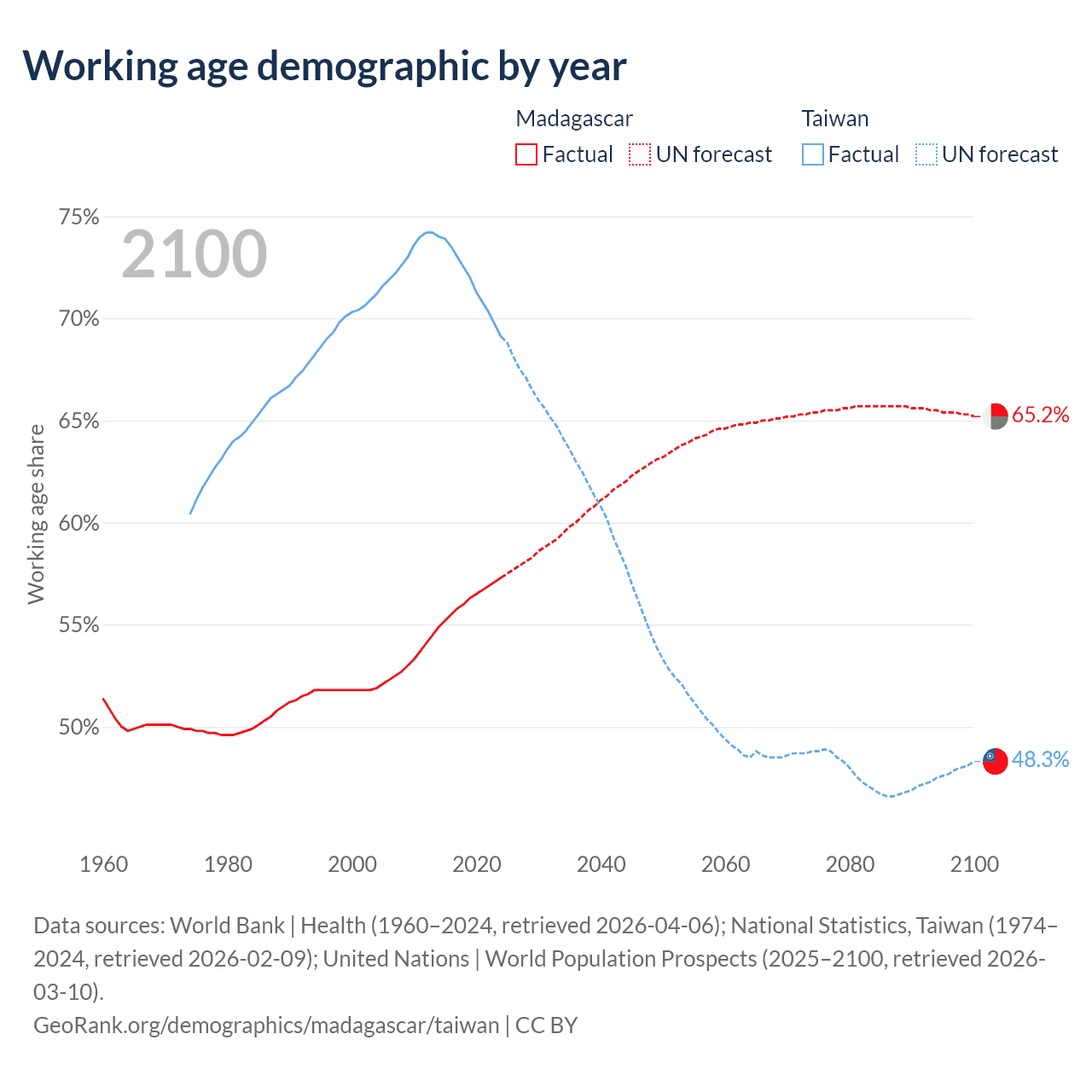 - Madagascar has 19.4M working age adults (aged 15-64) vs 16.1M in Taiwan.