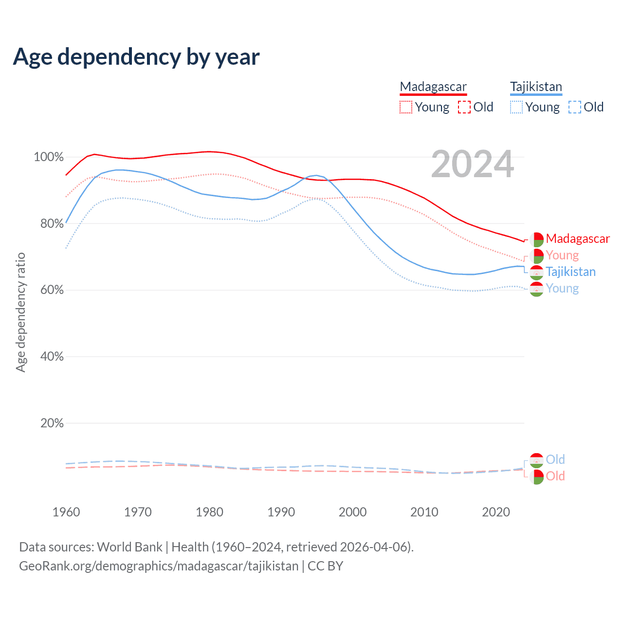 Data sources: World Bank | Health (1960–2024, retrieved 2026-04-06); U.S. Census Bureau (1960–2024, retrieved 2026-02-08).
