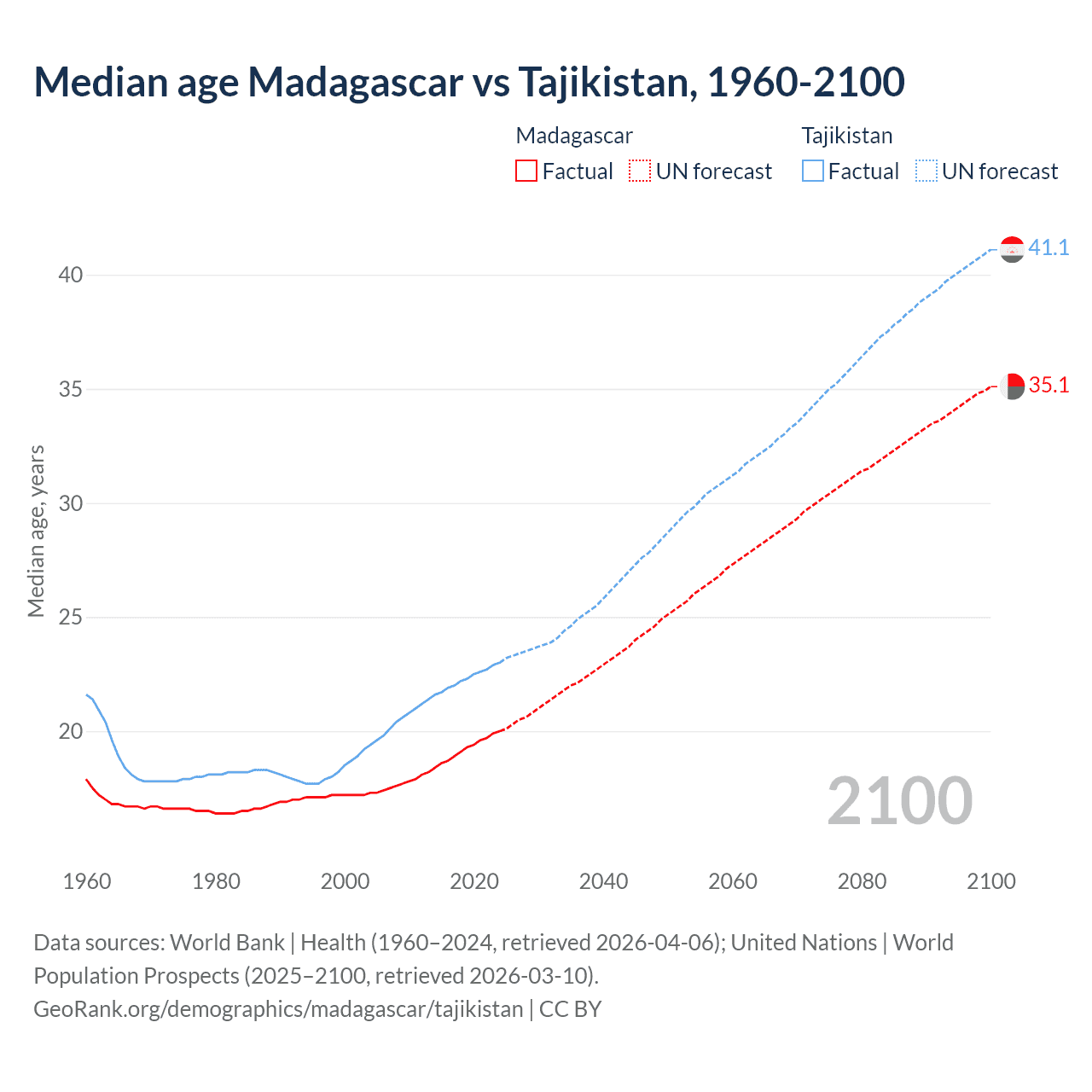 Median age Madagascar vs Tajikistan, 1960-2100