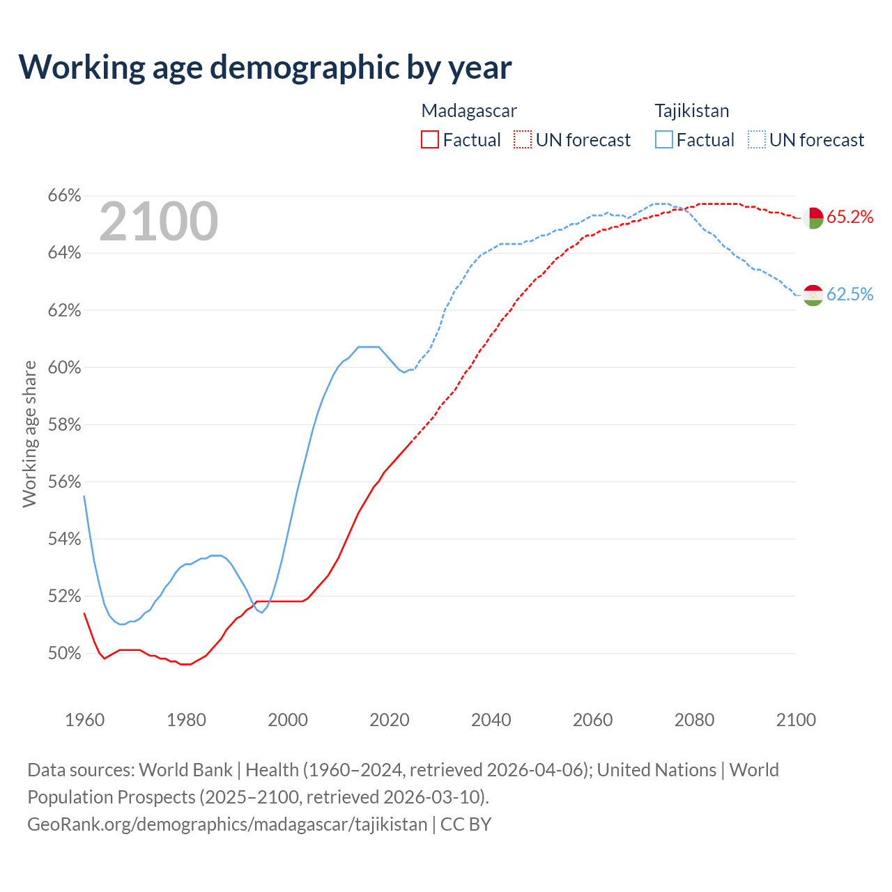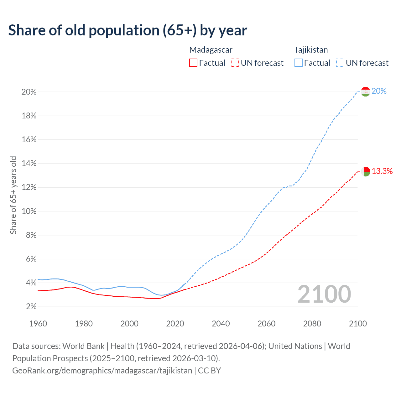 The share of older people aged 65 and over is 3.41% in Madagascar and 3.85% in Tajikistan. Life expectancy in Madagascar compared to Tajikistan .
