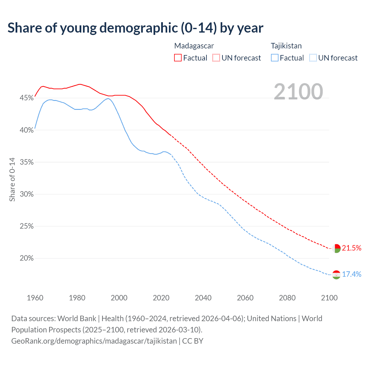 - The share of young demographic (0-15 years old) in Madagascar is 39.3% vs 36.3% in Tajikistan.