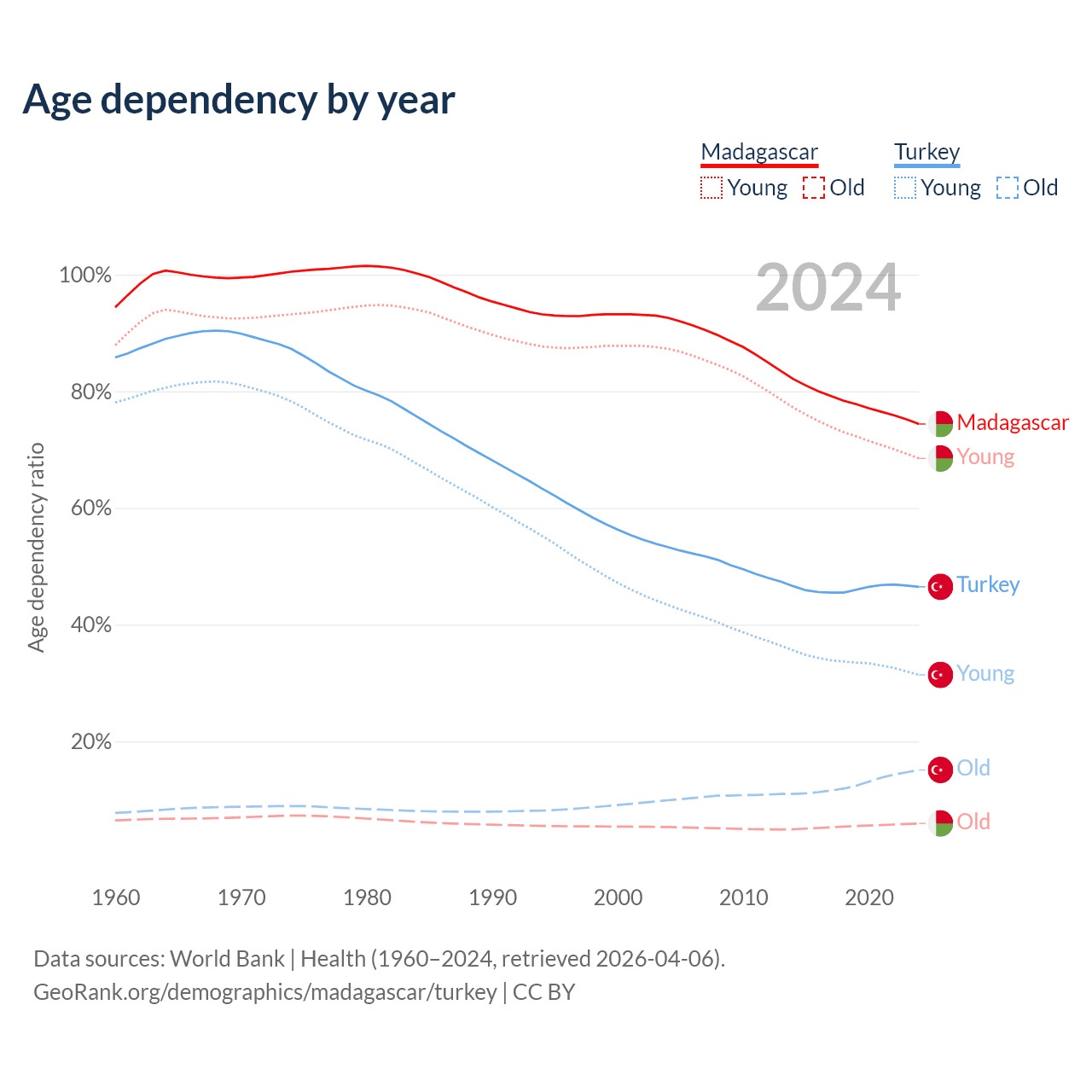 Data sources: World Bank | Health (1960–2024, retrieved 2026-04-06); U.S. Census Bureau (1960–2024, retrieved 2026-02-08).