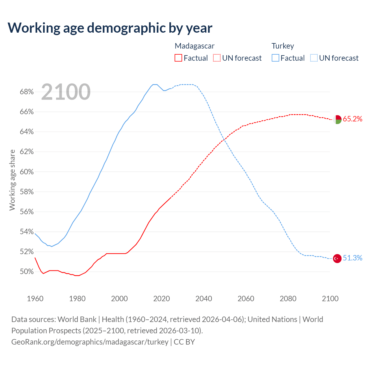 Median age Madagascar vs Turkey, 1960-2100