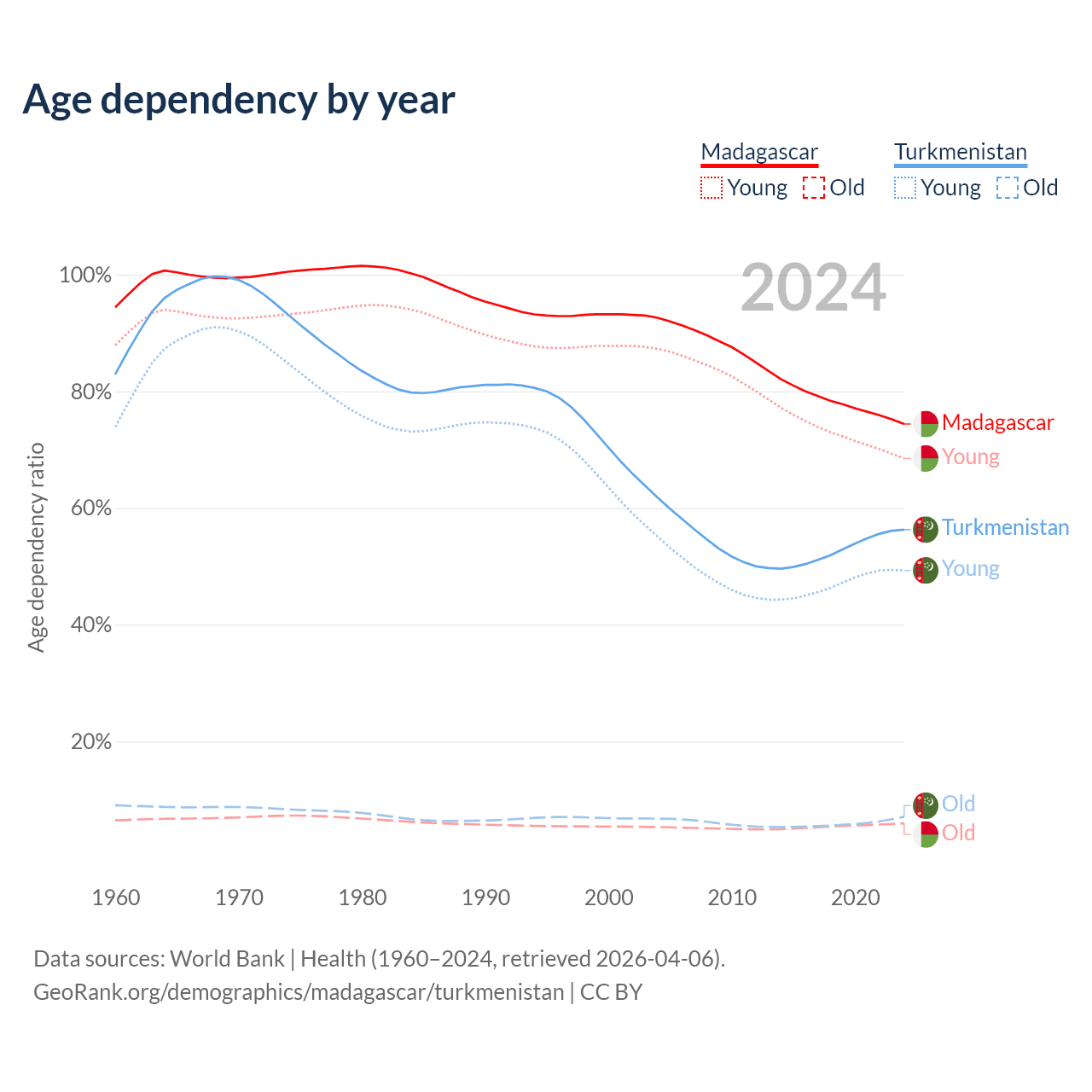 Data sources: World Bank | Health (1960–2024, retrieved 2026-04-06); U.S. Census Bureau (1960–2024, retrieved 2026-02-08).