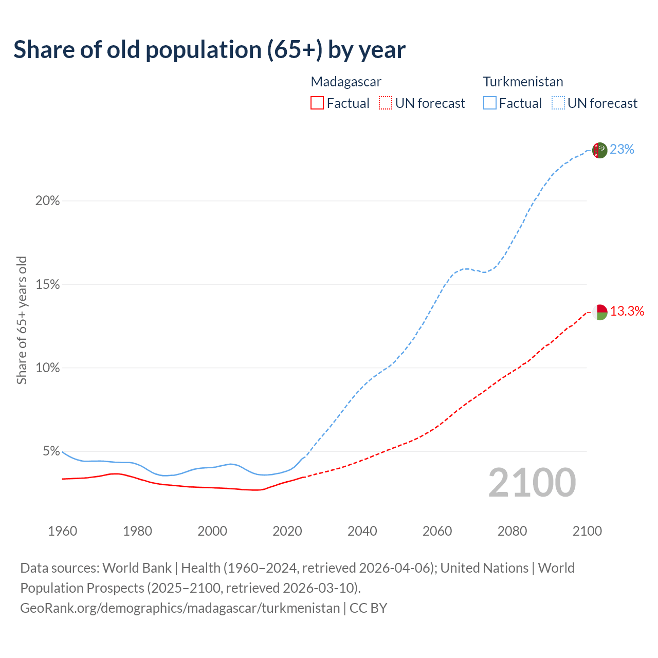 The share of older people aged 65 and over is 3.41% in Madagascar and 4.53% in Turkmenistan. Life expectancy in Madagascar compared to Turkmenistan .
