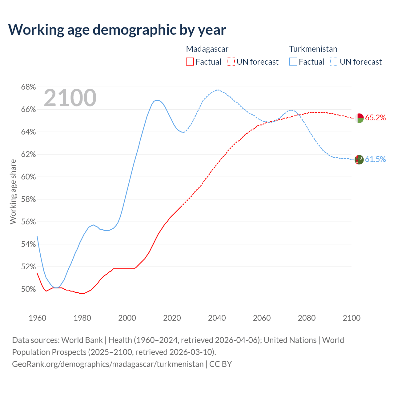 - Madagascar has 19.4M working age adults (aged 15-64) vs 4.97M in Turkmenistan.