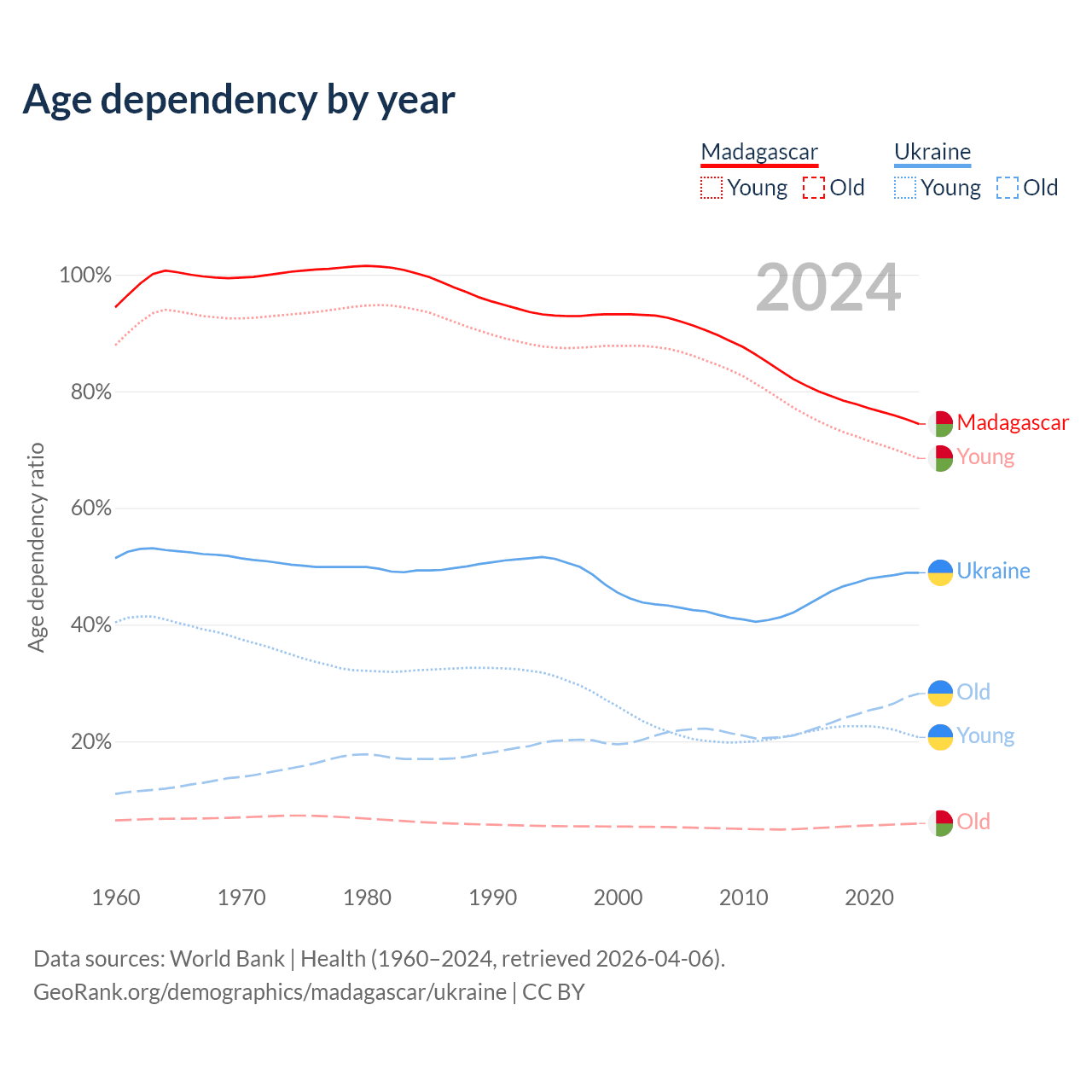 The share of older people aged 65 and over is 3.41% in Madagascar and 19% in Ukraine. Life expectancy in Madagascar compared to Ukraine .