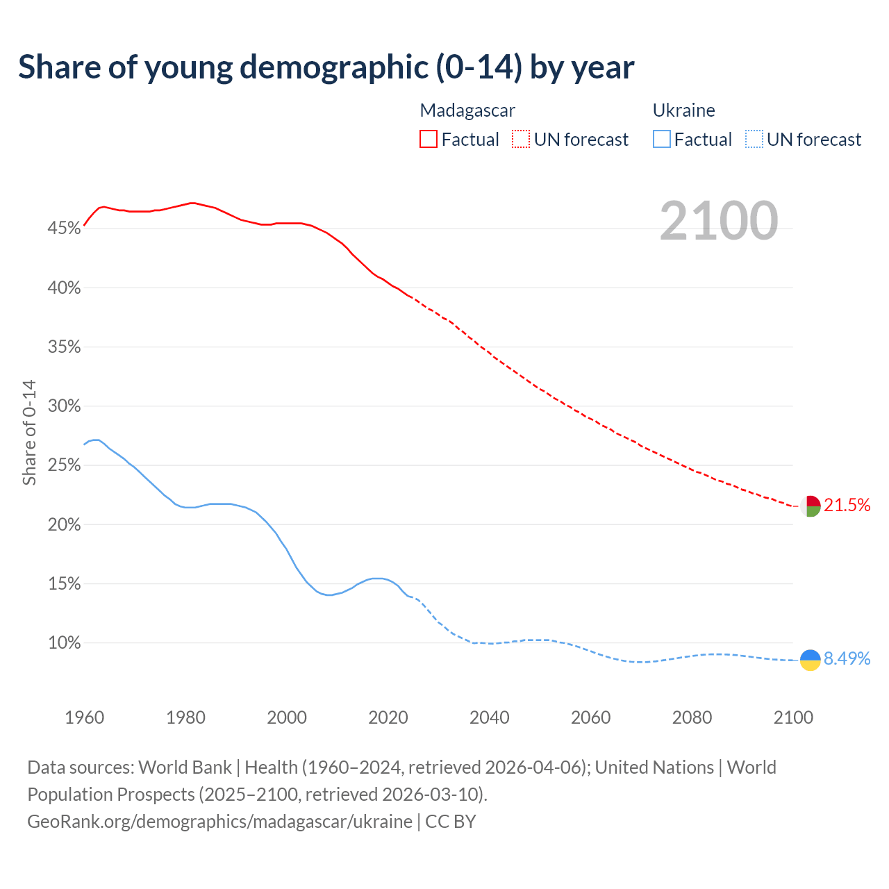 - The share of young demographic (0-15 years old) in Madagascar is 39.3% vs 13.9% in Ukraine.