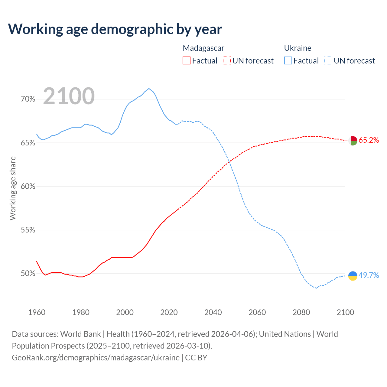 Median age Madagascar vs Ukraine, 1960-2100